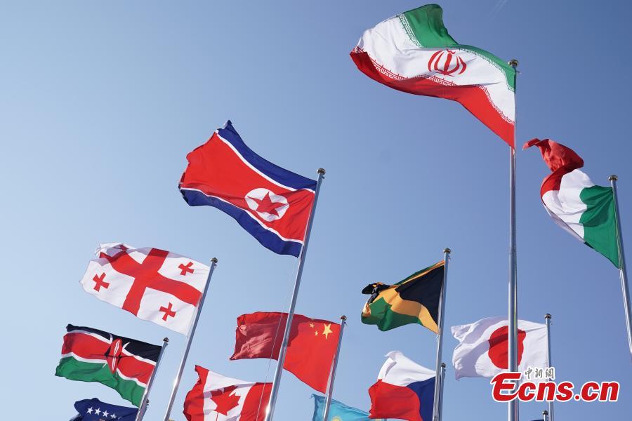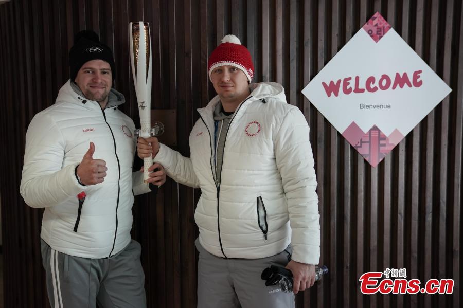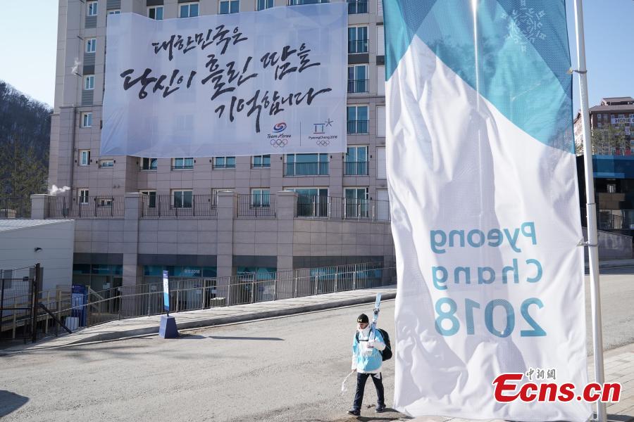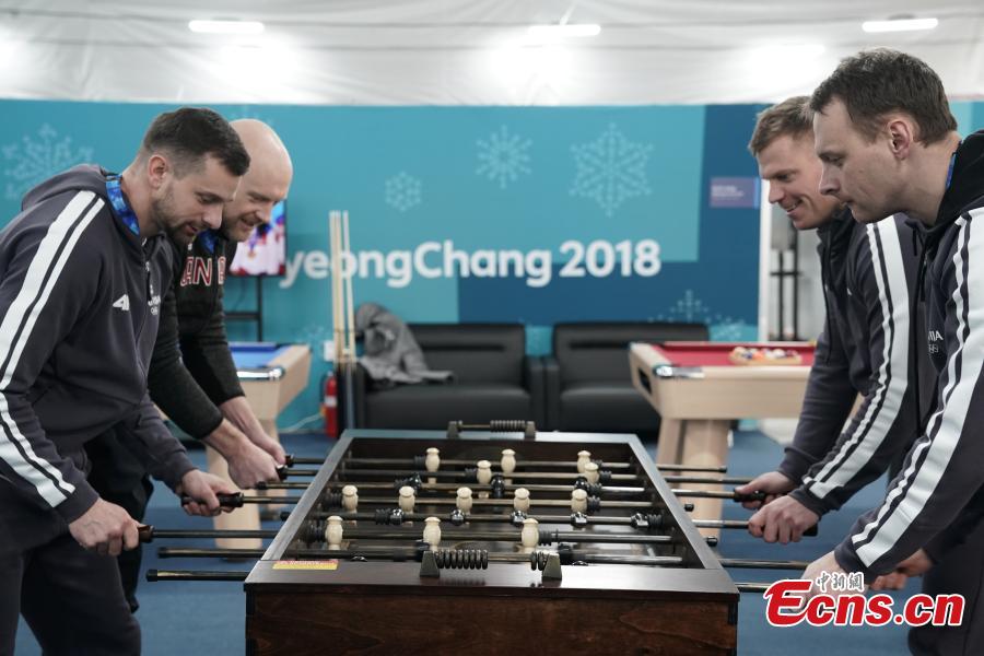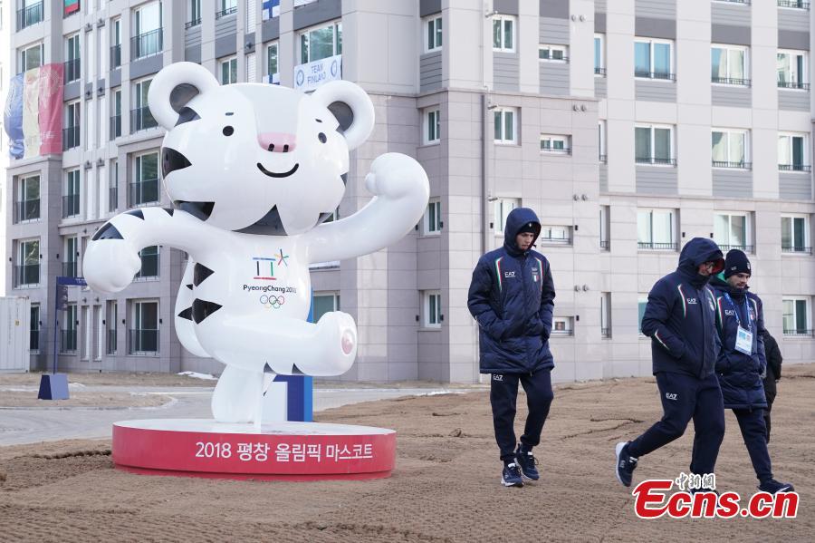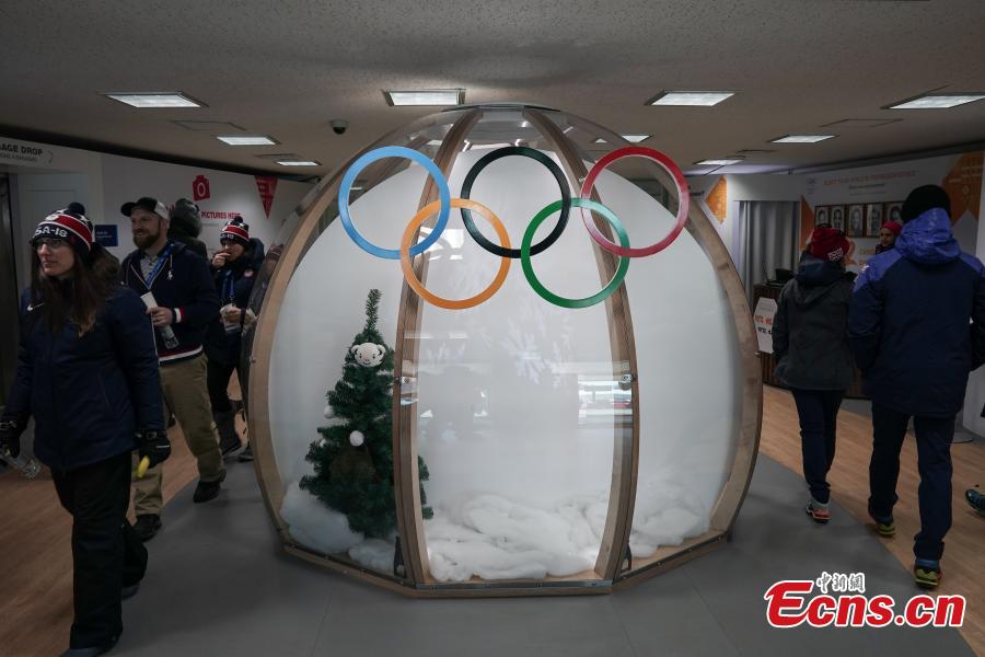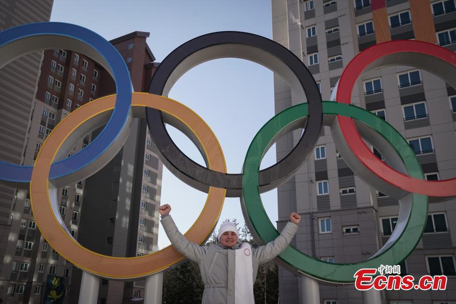 Three members of the German Olympic team pose with the Olympic rings at the Pyeongchang Olympic Village in Pyeongchang, South Korea, Feb. 5, 2018. The Pyeongchang Olympic Village will accommodate some 3,500 athletes. (Photo: China News Service/Cui Nan)