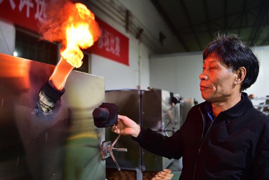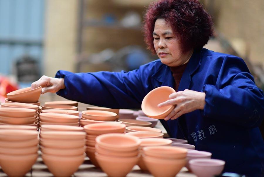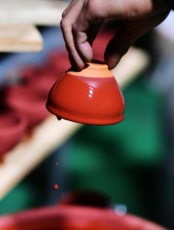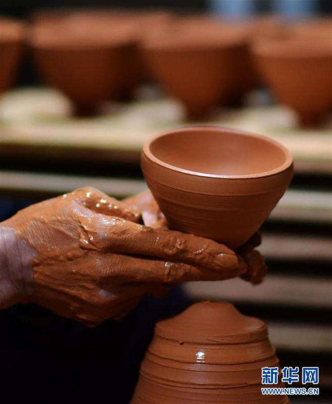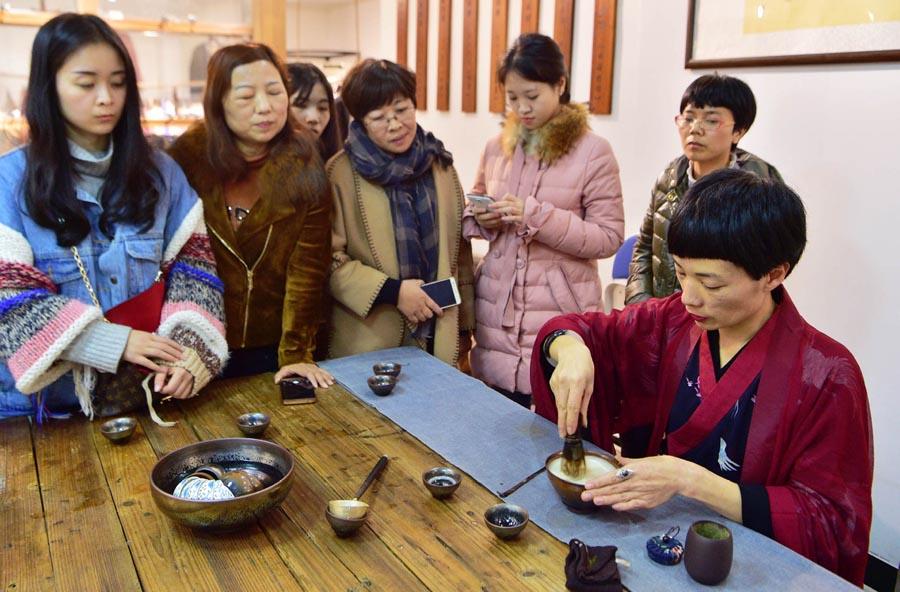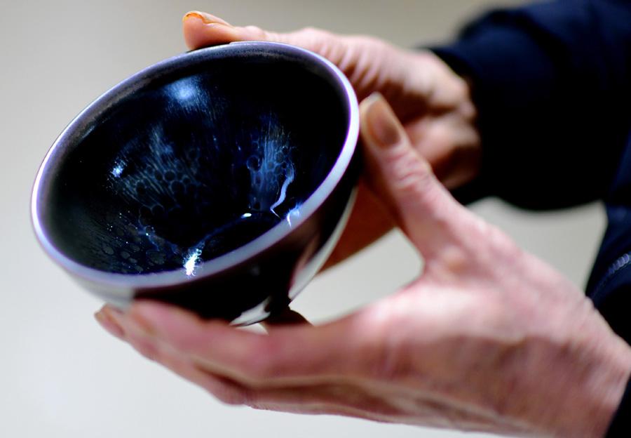 Craftsman Wu Lizhu shows a piece of Jianzhan porcelain that he made on Jan. 24, 2018. Jianzhan porcelain was among the eight most famous varieties of porcelain back in ancient China's Song Dynasty (960-1127). Production techniques for the porcelain were listed as a national intangible cultural heritage in China in 2011. (Photo/Xinhua)