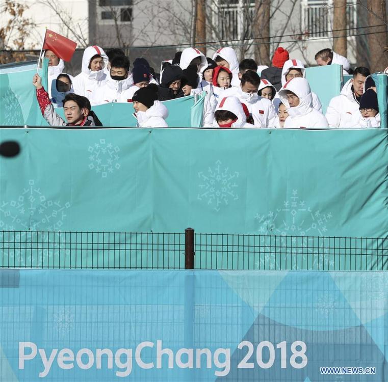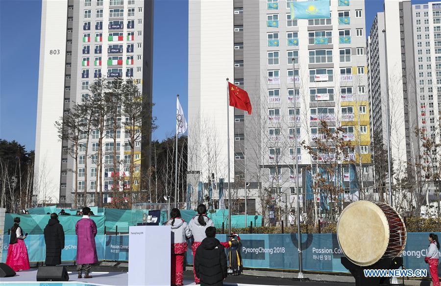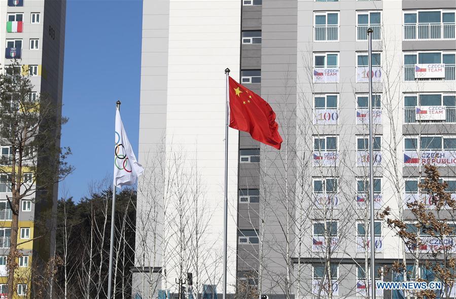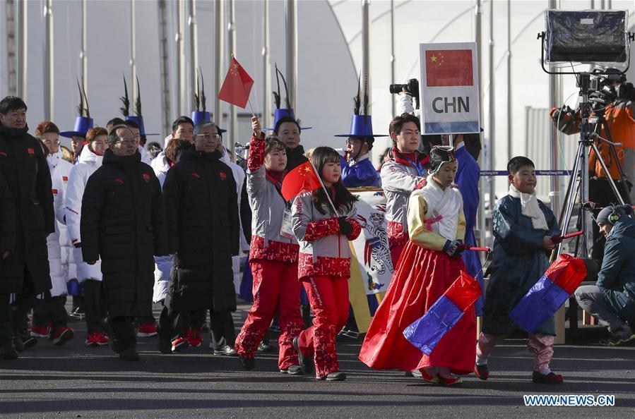 Chinese delegation enters the venue of the Team Welcome Ceremony in the Gangneung Olympic Village ahead of the 2018 PyeongChang Winter Olympic Games, South Korea, on Feb. 7, 2018. (Xinhua/Han Yan)