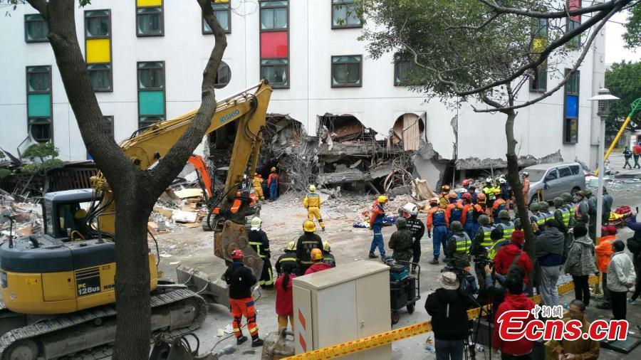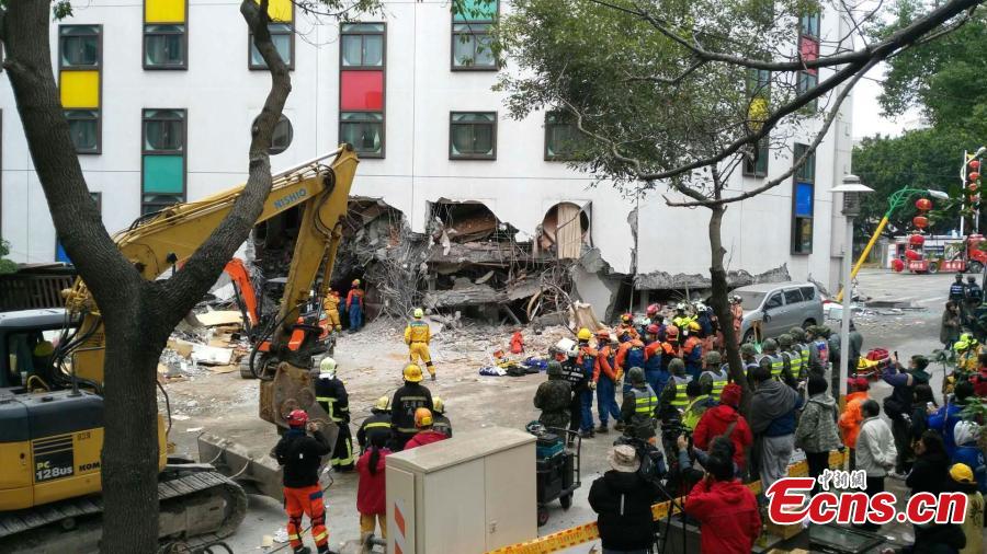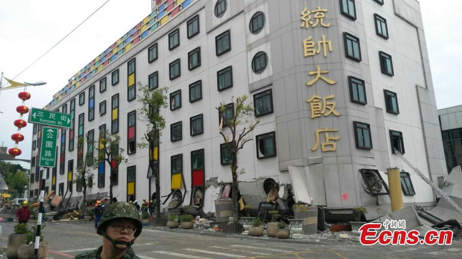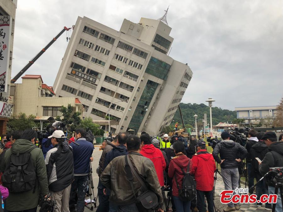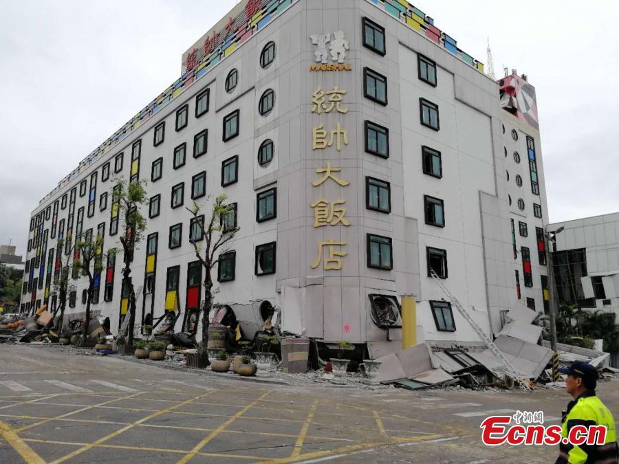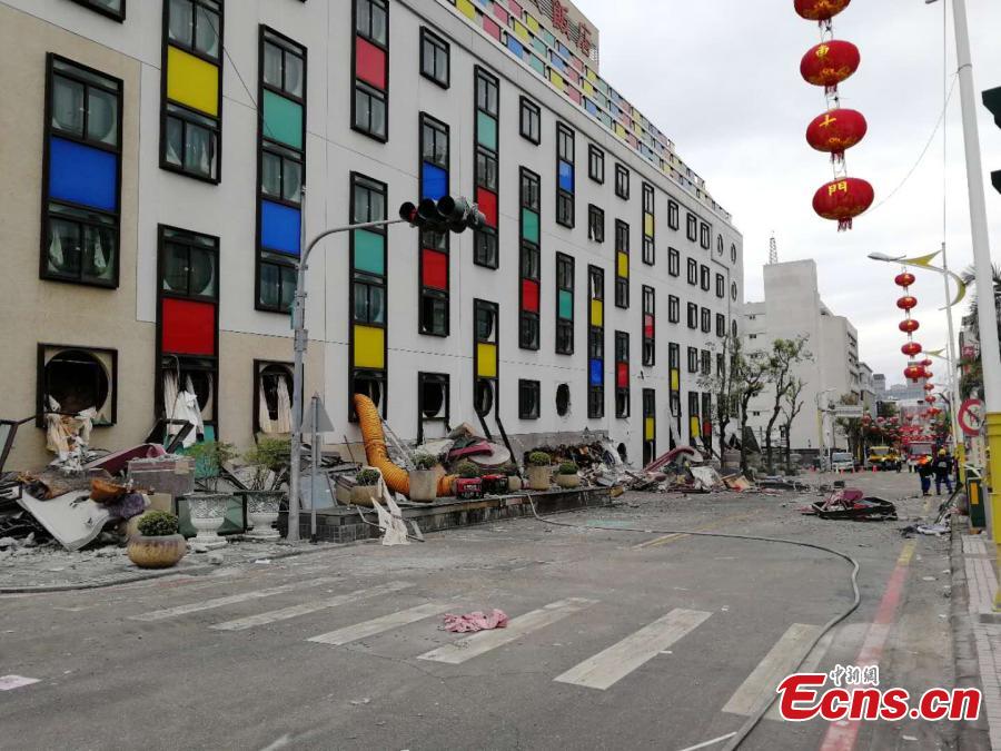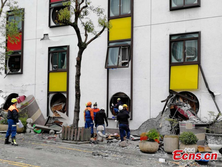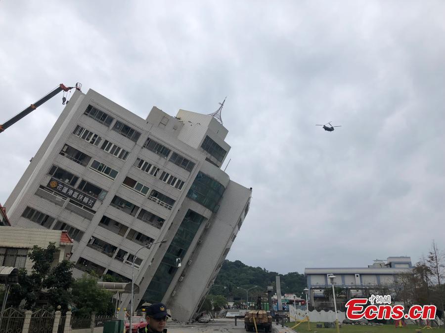 A damaged residential building is seen after an earthquake hit Hualien, Taiwan island, Feb. 7, 2018. Nine people were killed, 265 injured and 62 still missing as of 7:00 a.m. Thursday after a magnitude 6.5 earthquake hit Taiwan's Hualien County. (Photo: China News Service/Ye Qinglin)