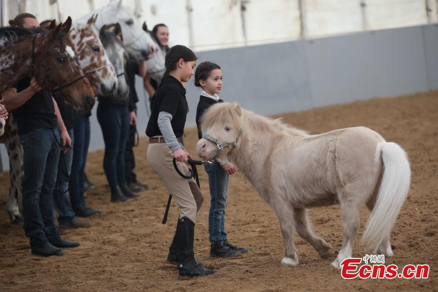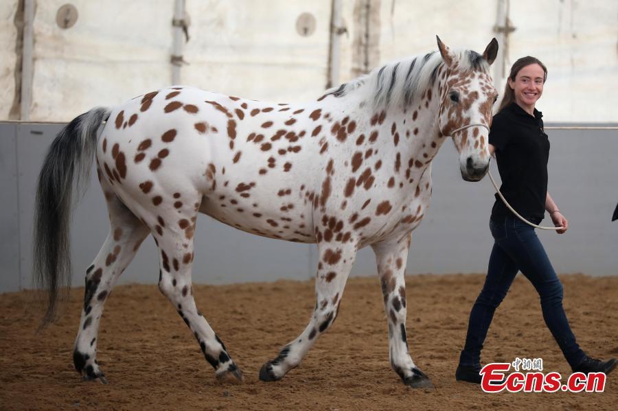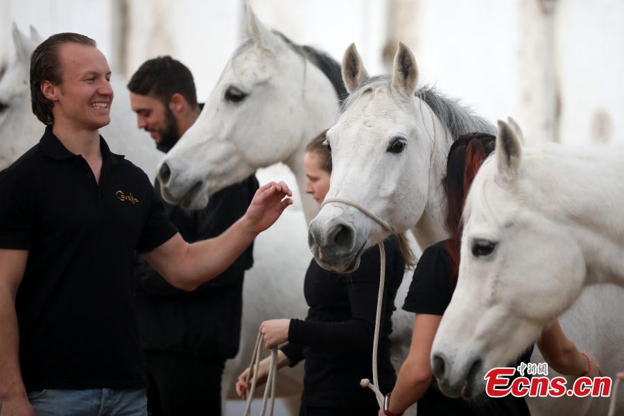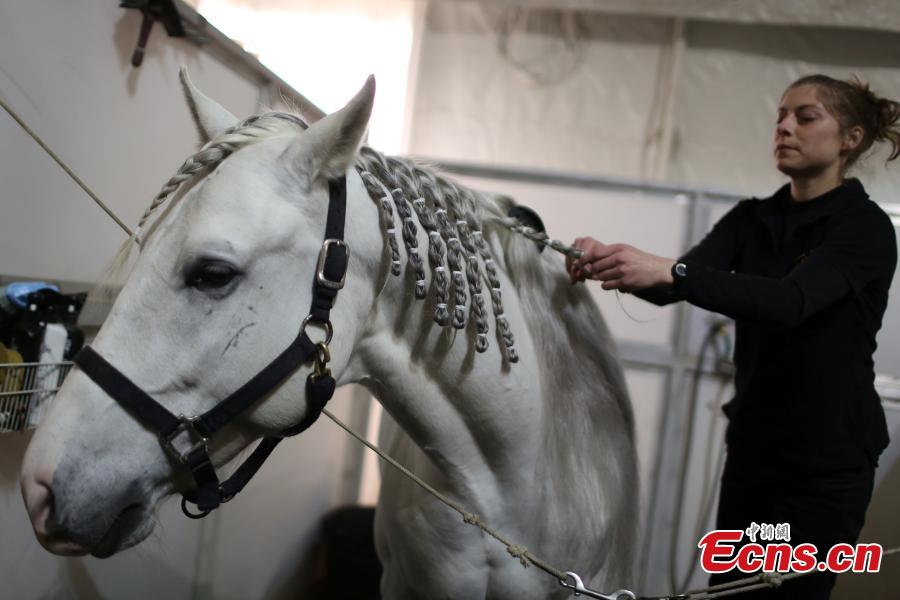 A horse for the multimedia spectacular, Cavalia, in Tangshan scenic area in Nanjing City, the capital of East China’s Jiangsu Province, Feb. 7, 2018. Involving more than 40 horses and 40 riders, and aerialists, acrobats, dancers and musicians, the show is a tribute to the bond that exists between the animal and people. (Photo: China News Service/Yang Bo)