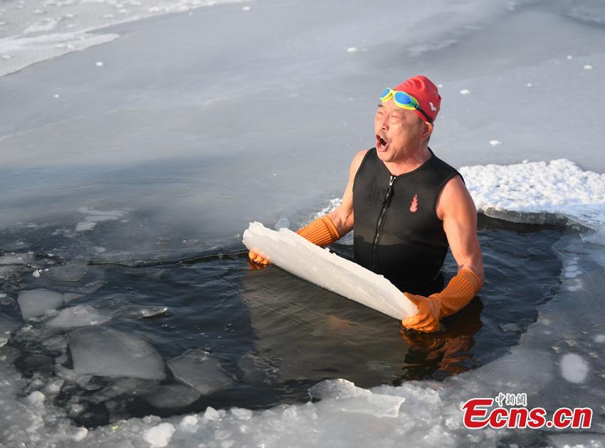 Zhang Minshi, 64, holds a block of ice in a frozen lake in Changchun City, the capital of Northeast China’s Jilin Province, Feb. 7, 2018. Among a group of local winter swimmers, Zhang has made a reputation for himself as he often sang or lifted blocks of ice to keep fit. (Photo: China News Service/Zhang Yao)