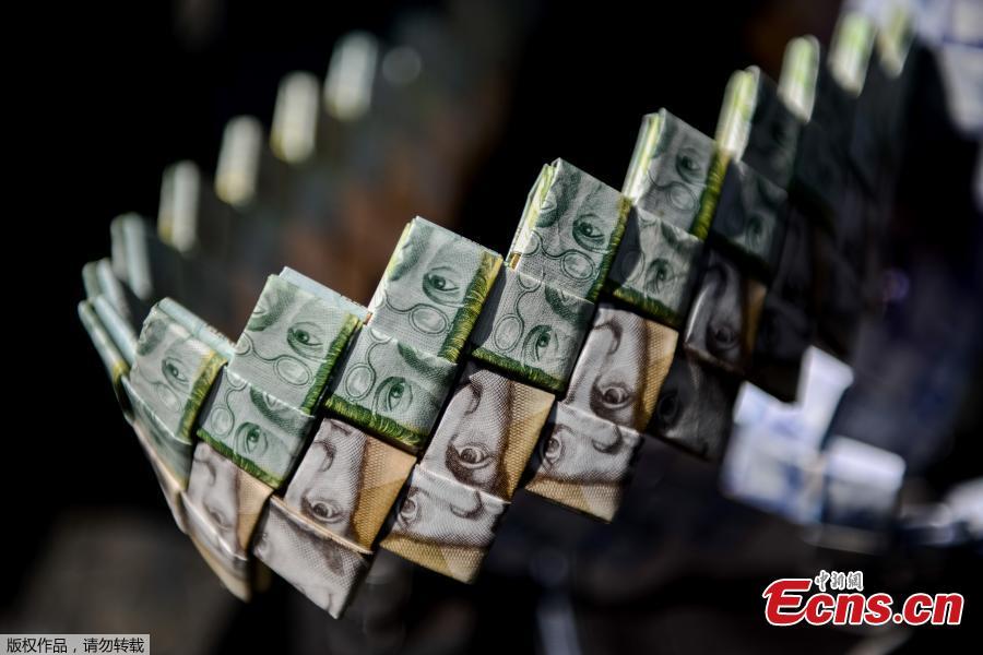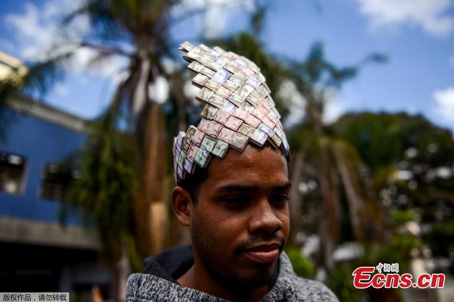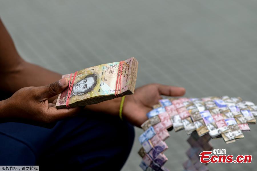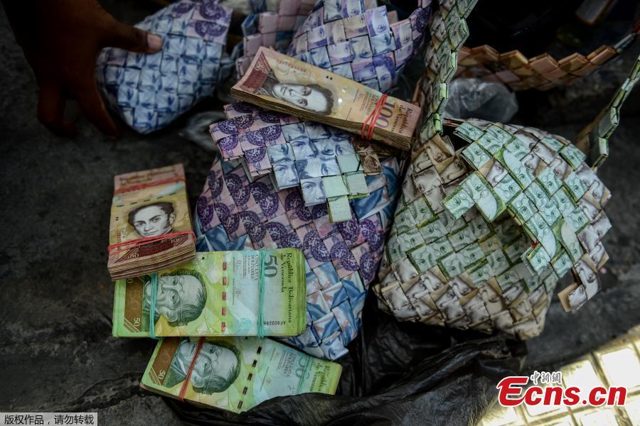 Wilmer Rojas, 25, shows the purses he sewn up, using Bolivar bills in Caracas, Jan. 30, 2018. The young Venezuelan tries to make a living out of devalued Bolivar banknotes by making crafts with them. Venezuela's central bank on Monday announced a devaluation of more than 99 percent of its official exchange rate with the launch of a new foreign exchange platform. (Photo/Agencies)