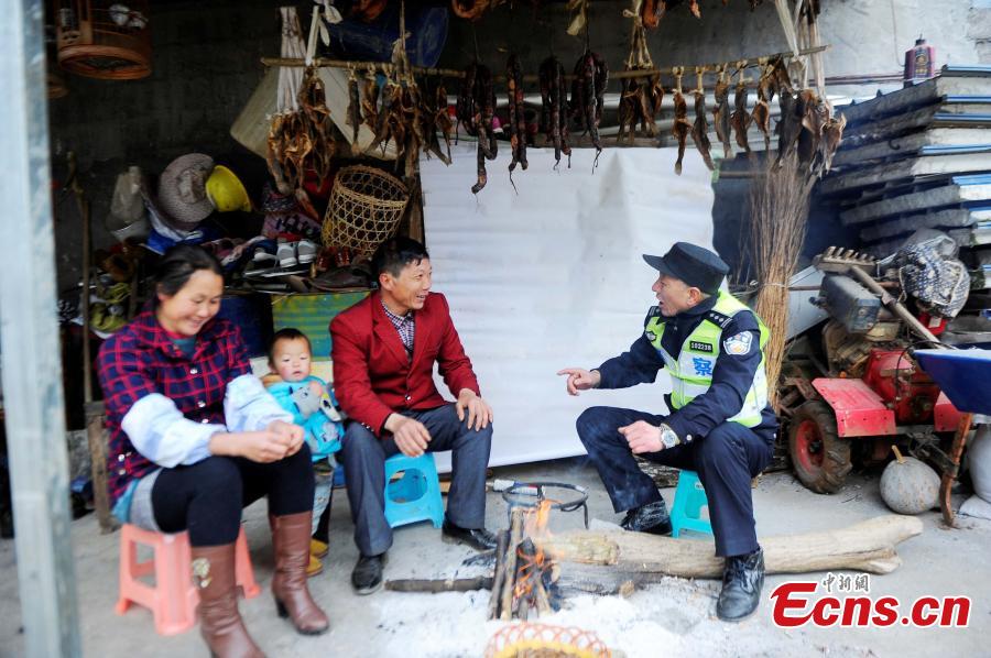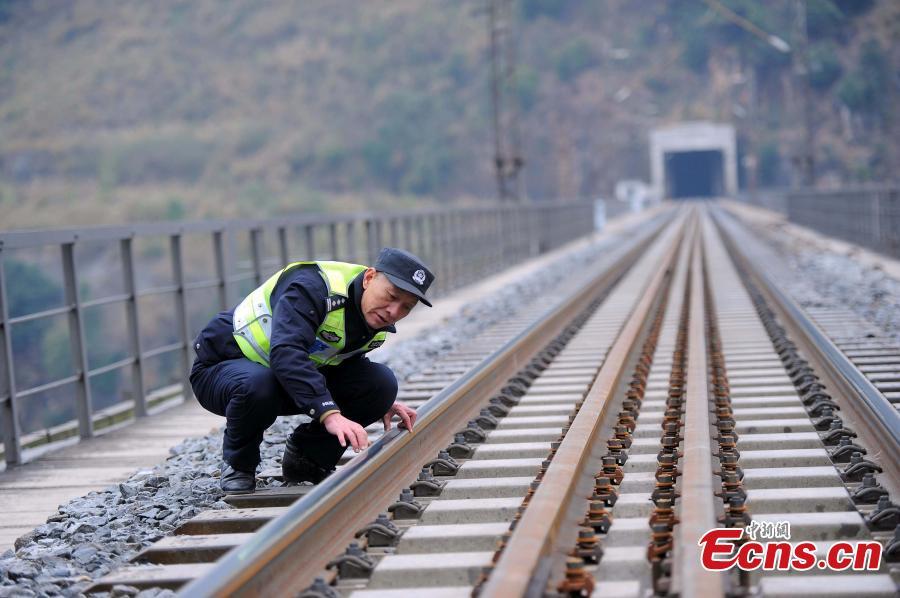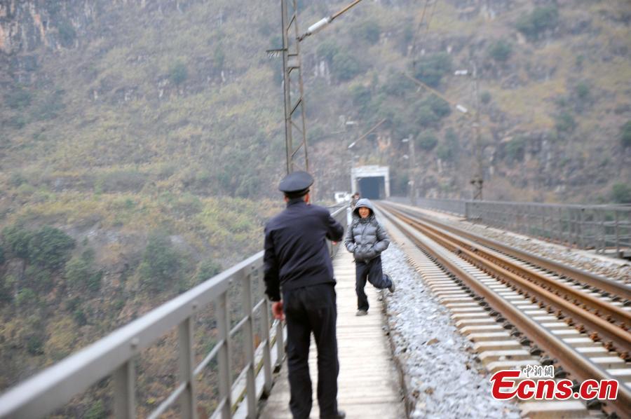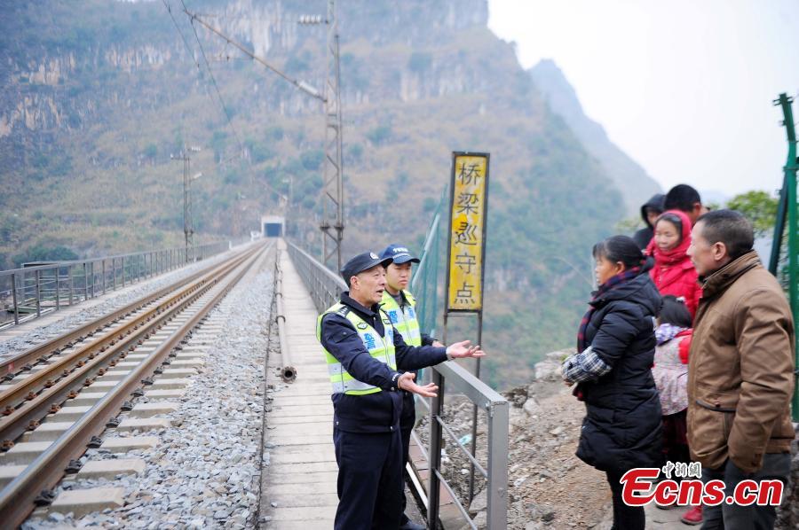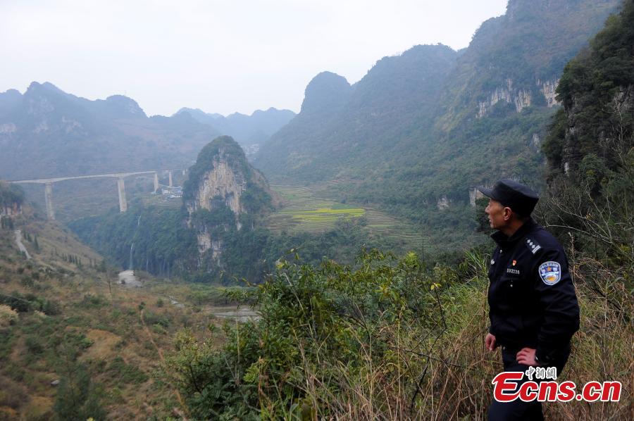 Police officer Yang Fuming inspects the Qingshui River Railway Bridge in Xingyi County, Southwest China’s Guizhou Province. The bridge on a railway line connecting Nanning City in Guangxi Zhuang Autonomous Region and Kunming City in Yunnan Province is over the deep gorge of the Quigshui River and is one of the highest railway bridges in the world, at 183 meters high. Yang has secured the bridge for 12 years and he will retire in May. Local police authorities had suggested Yang spend Spring Festival, China’s Lunar New Year, with his family, but Yang insisted on working the holiday, saying “this is my last duty and I feel bad to leave earlier”. As the bridge is located in a remote area, Yang is the only police officer in the area, and he often feels alone, so he has a habit of reading aloud for 10 minutes every day to help maintain his verbal communication skills. (Photo: China News Service/Jiang Xuelin)