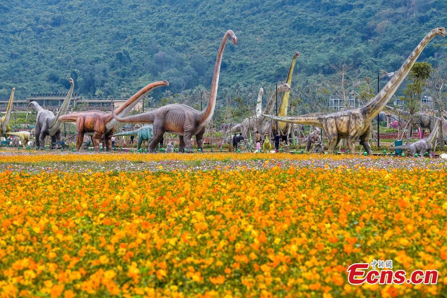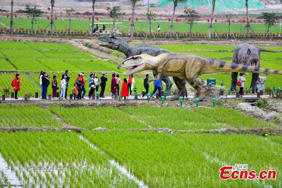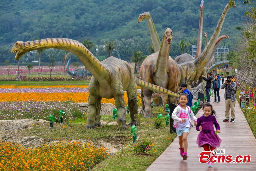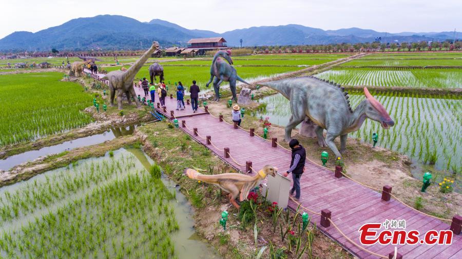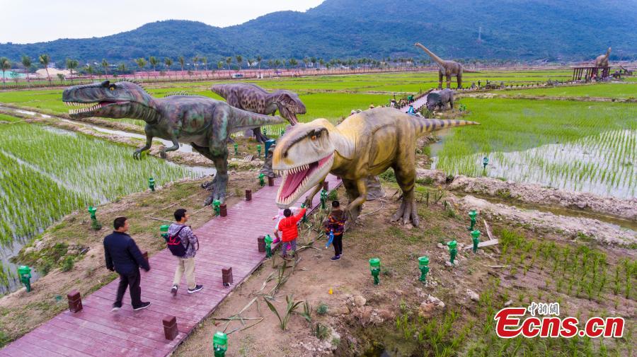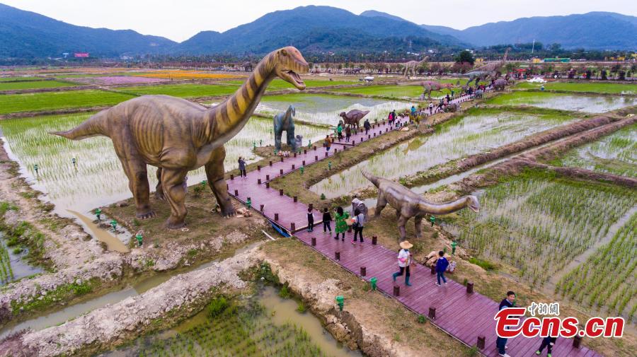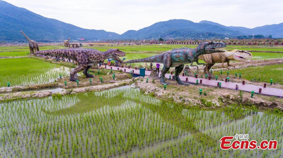 Life-size dinosaur models at a rice park in Sanya City, South China’s Hainan Province, Feb. 7, 2018. The park has installed 323 models of 277 species of dinosaurs ranging in size from less than 1 meter to 38 meters high. (Photo: China News Service/Luo Yunfei)