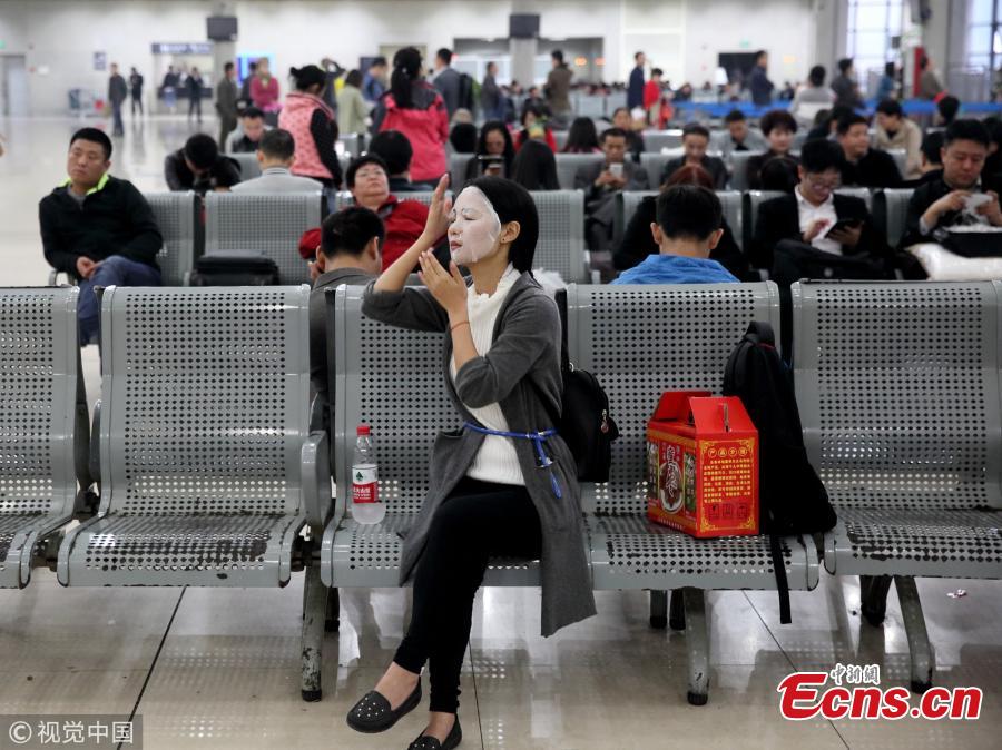 A woman applies a beauty mask on her face as she waits for a train at a railway station in Yiwu City, East China’s Zhejiang Province, Oct. 31, 2015. (Photo/VCG)