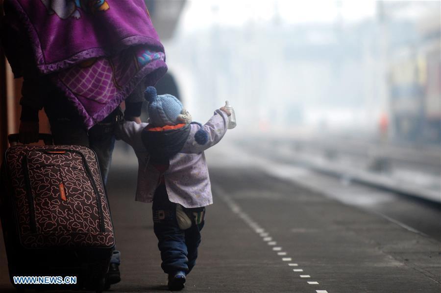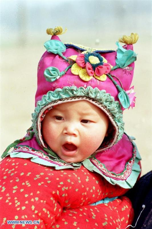 File photo taken on Feb. 1, 2014 shows a child watching a humorous pig mask at a temple fair in Zhengzhou, central China's Henan Province. Kids are probably the most joyful group during the Spring Festival as they have the chance to taste snacks and take part in festive activities. The most meaningful thing for them is that these moments will become one part of their tradition as they grow up. Spring Festival, or better known as Chinese Lunar New Year, is the most important festival for all Chinese, which has a history of more than 4,000 years. It is an occasion for home returning, New Year goods preparing, celebrating, and foremost, family reunion. (Xinhua/Wang Song)