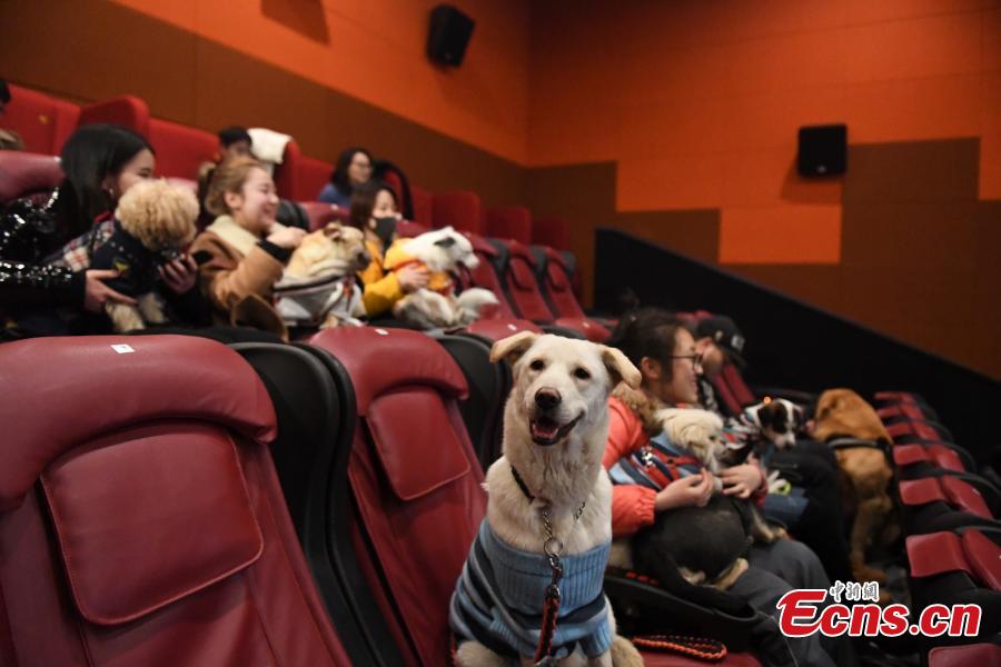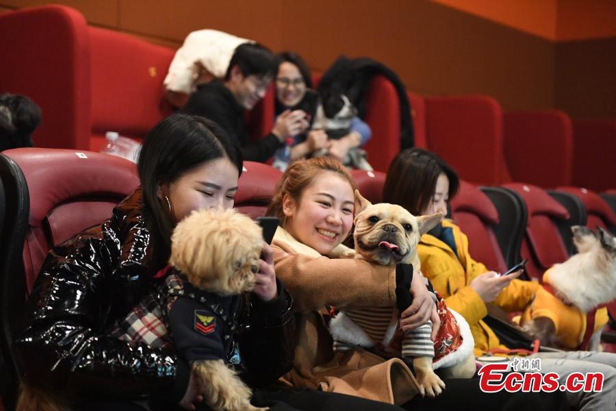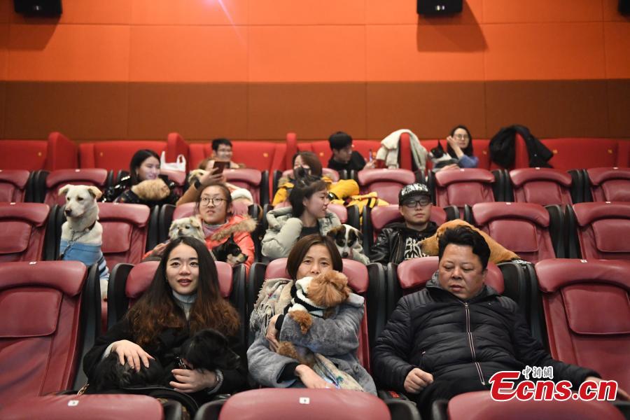 Movie-goers with their pet dogs wait to watch a film at a cinema in Hangzhou City, the capital of East China’s Zhejiang Province, Feb. 8, 2018. The cinema invited dog owners to enjoy a film to celebrate the Spring Festival, China’s Lunar New Year. 2018 is the Year of the Dog in the Chinese calendar. (Photo: China News Service/Wang Yuan)
