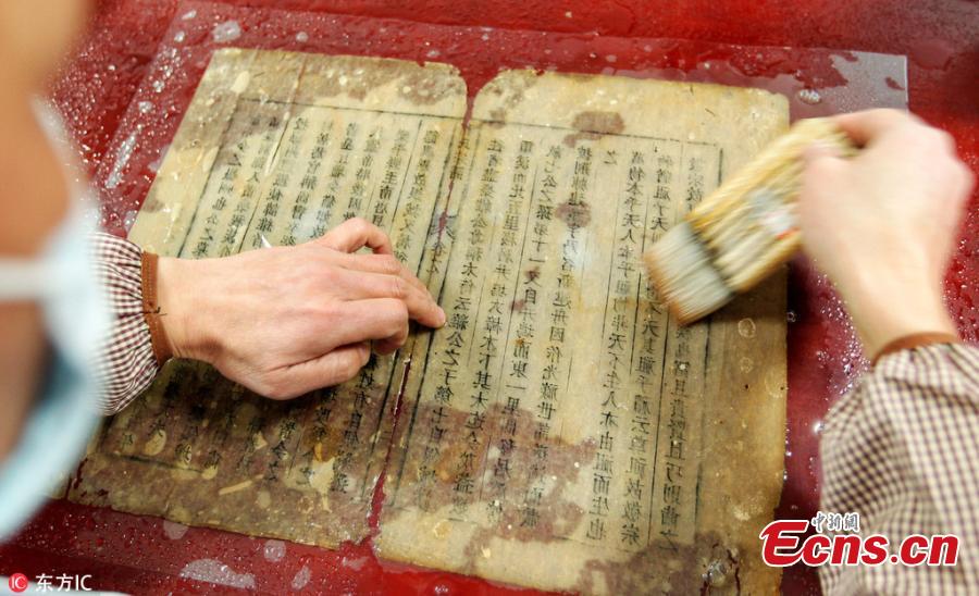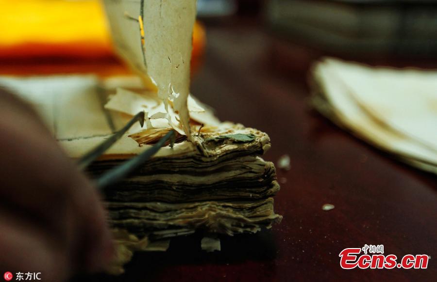 Zhu Lyuzhong, 49, repairs damaged outdated books at the archives center of Dexing City, East China’s Jiangxi Province, Feb. 6, 2018. Zhu, once a fine arts teacher at an elementary school, started repairing valuable books and letters that had deteriorated over time in Aug. 2016. Zhu said book restoration is quite time-consuming and details-orientated but he enjoys the solo work, which he completes in a 40-sqm studio space. (Photo/IC)