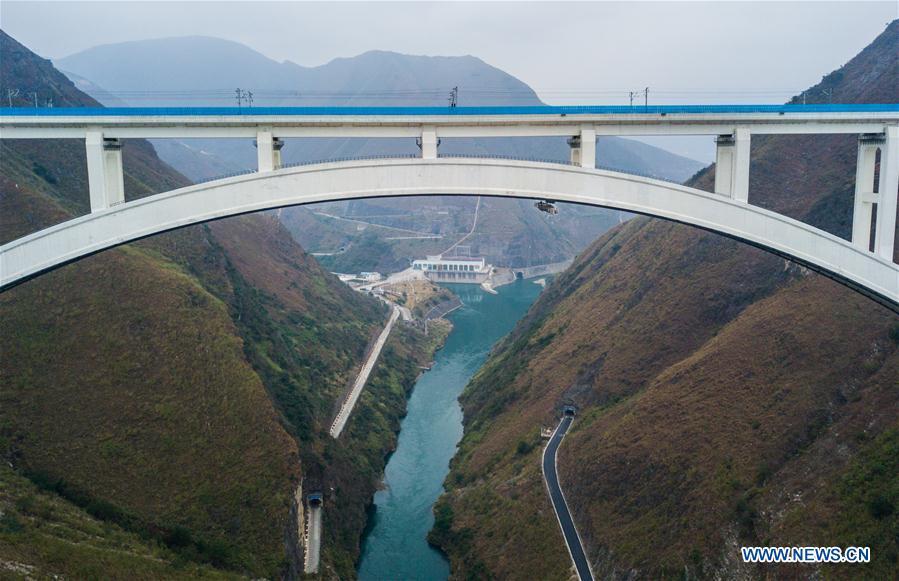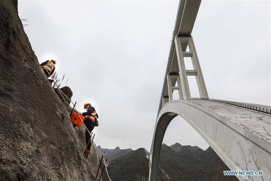 Bridge maintenance workers work under the arch of the Beipanjiang railway bridge in southwest China's Guizhou Province, Jan. 26, 2018. The high-speed railway bridge, 721 meters in length, is a part of the Shanghai-Kunming high-speed railway line, which links the country's prosperous eastern coast with the less-developed southwest. Maintenance workers examine the bridge everyday to make sure the safety of the railway line. (Xinhua/Liu Xu)