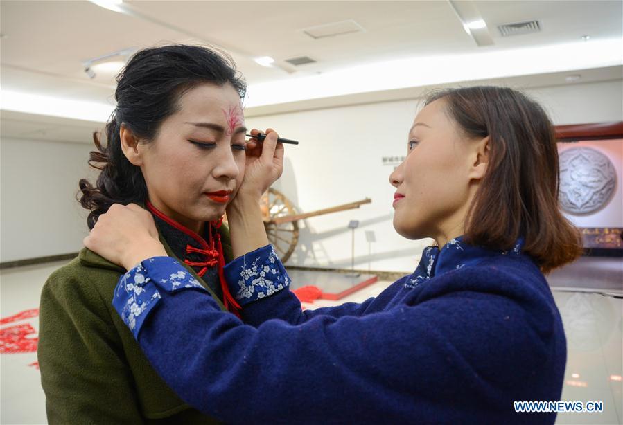 Photo taken on Feb. 10, 2018 shows cheongsam hobbyists dressed in cheongsam decorated with paper cuttings designed by Liang Ying in Liaocheng, east China's Shandong Province. Liang Ying, provincial-level inheritor of traditional Chinese paper cutting, which is one of the intangible cultural heritages, designs paper cutting ornaments for the cheongsam, or qipao in Mandarin Chinese, to greet the Chinese lunar New Year. (Xinhua/Xu Wenhao)