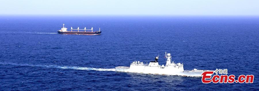 A Chinese soldier takes aim as the guided-missile frigate Yancheng of the 28th Chinese naval escort taskforce escorts SELIN-M, a merchant ship transporting humanitarian supplies for the United Nations World Food Program (UNWFP) in waters off in the Kenyan port of Mombasa, Feb. 10, 2018. It took eight days to complete the escort mission through the Gulf of Aden and waters off Somali. Chinese naval escort taskforces have safeguarded the UNWFP ships twelve times since 2008. (Photo: China News Service/Zhu Linlin)