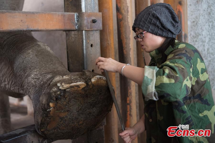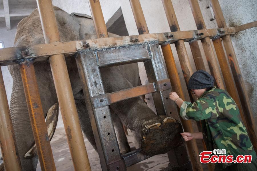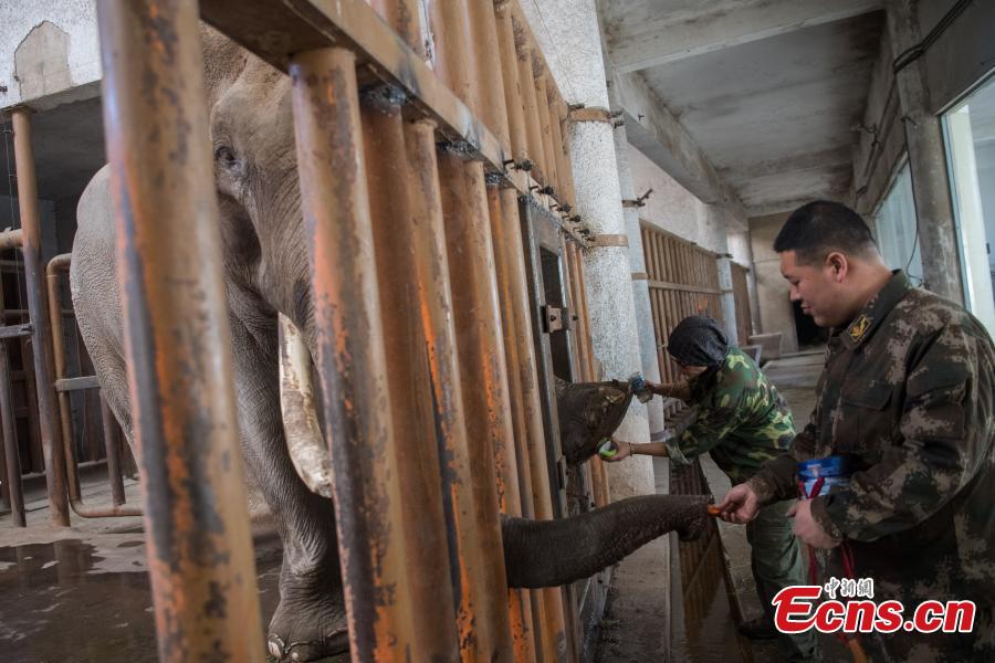 A keeper cleans the feet of an elephant while another keeper feeds the animal at a zoo in Taiyuan City, the capital of North China’s Shanxi Province, Feb. 12, 2018. Keepers washed the elephant’s feet and trimmed its nails ahead of the Spring Festival holiday when greater numbers of visitors are expected. (Photo: China News Service/Wei Liang)