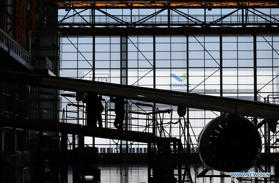 China's large passenger aircraft, the C919, is seen at the assembly line in Shanghai, east China, Feb. 13, 2018. Staff members here stick to their post to test the C919 to acquire its airworthiness certificates. (Xinhua/Ding Ting)