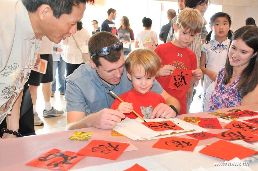 Visitors select souvenirs of Chinese Lunar New Year at the Asia Society Texas Center in Houston, Texas, the United States, on Feb. 17, 2018. Asia Society Texas center in Houston held Chinese Lunar New Year celebrations Saturday afternoon with local Americans and Chinese participating in all kinds of activities and performances. (Xinhua/Liu Liwei)
