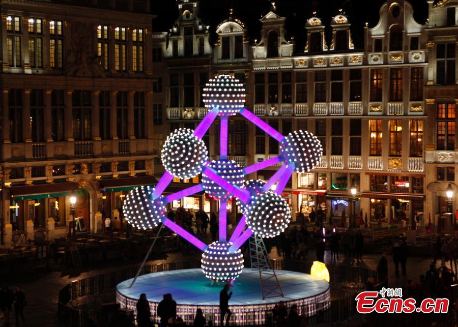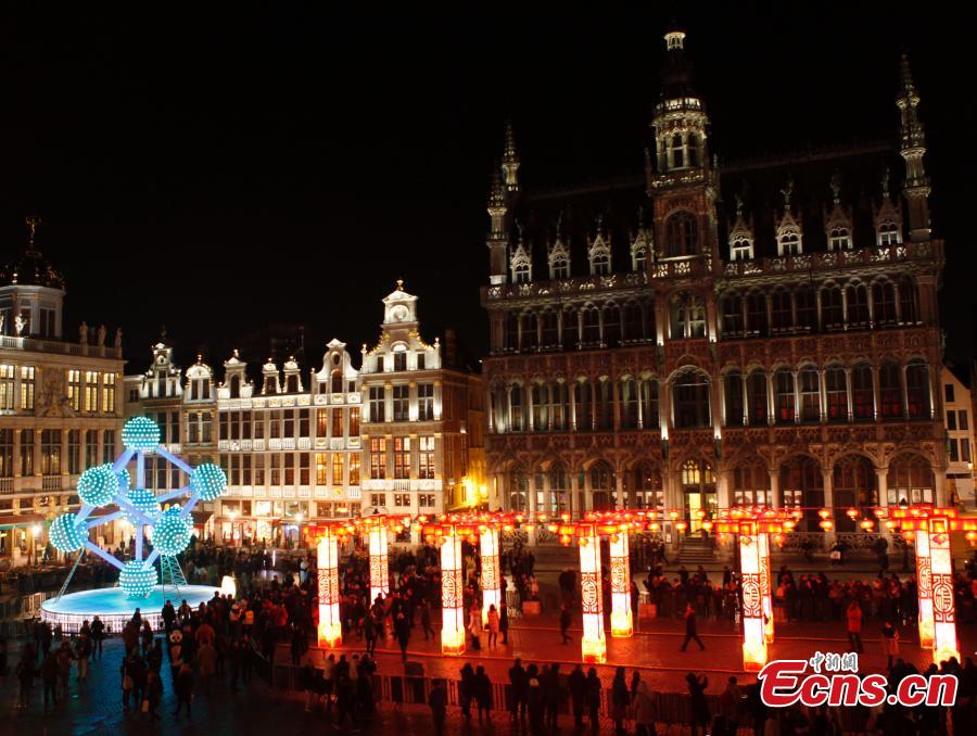 A lantern show at the Grand Place in Brussels, Belgium, Feb. 22, 2018, in the run up to China’s Lantern Festival that falls on March 2. Traditionally, Chinese make lanterns and rice balls, which represent reunion, on the Lantern Festival, the first full moon of a new lunar year. (Photo: China News Service/De Yongjian)