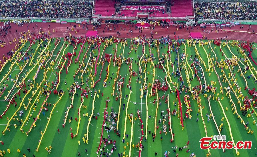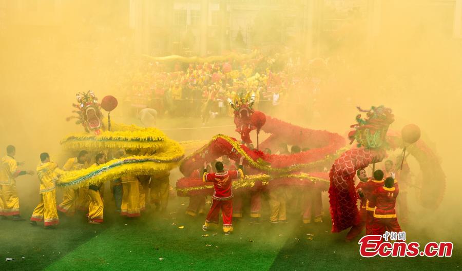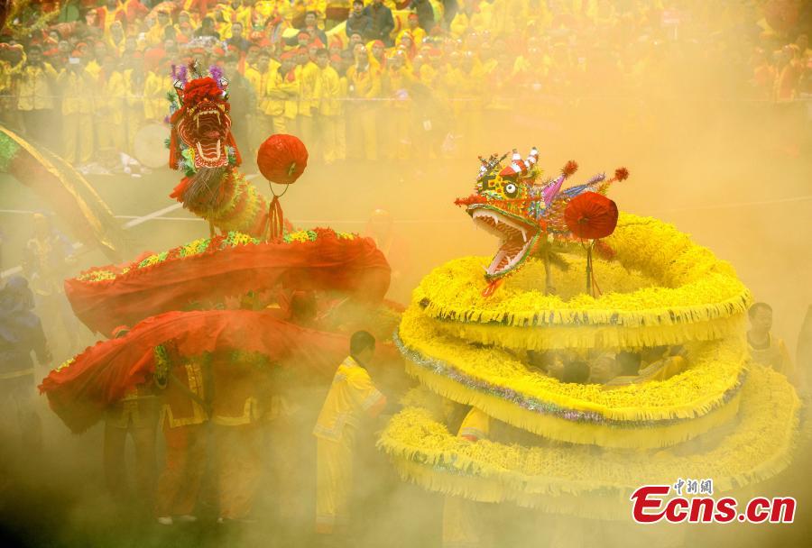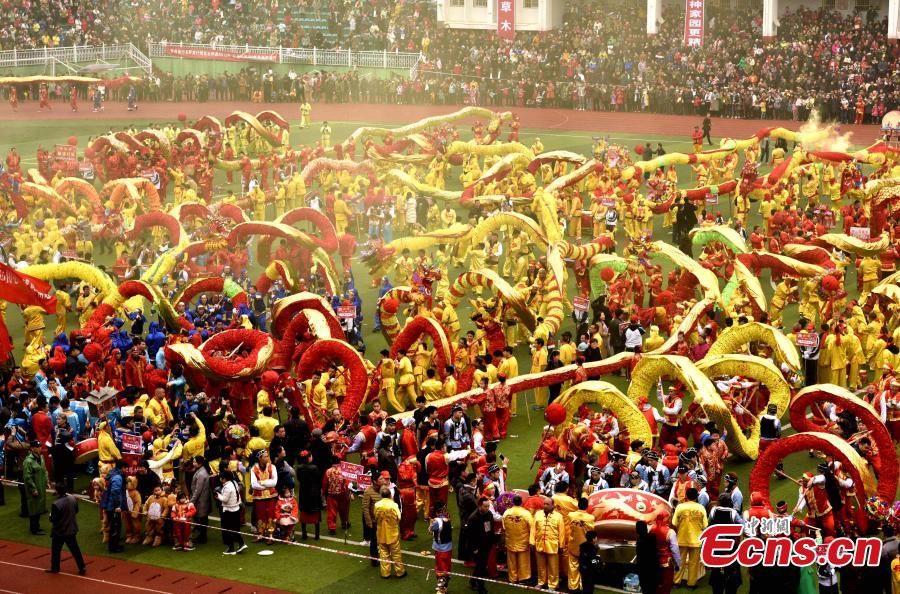 Gelao people participate in a dragon dance during the Maolong Festival in Shiqian County, Southwest China’s Guizhou Province, Feb. 26, 2018. People of the Gelao ethic group perform the dragon dance to celebrate the Maolong Festival in the period of the Lantern Festival. The traditional Gelao festival was recognized as a national intangible cultural heritage in May 20106. (Photo: China News Service/Long Yuanbin)