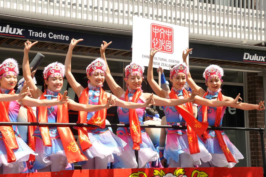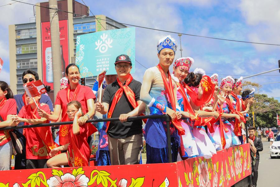 Guo Zongguang, director of the China Cultural Center in New Zealand and Jill Day, deputy mayor of Wellington, are on the first float of the “Happy Chinese New Year” parade in Wellington on Feb 17, 2018. (Photo/Chinaculture.org)