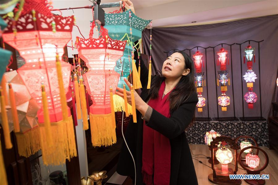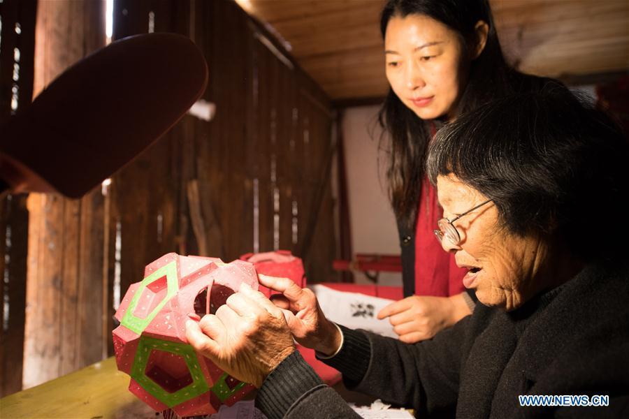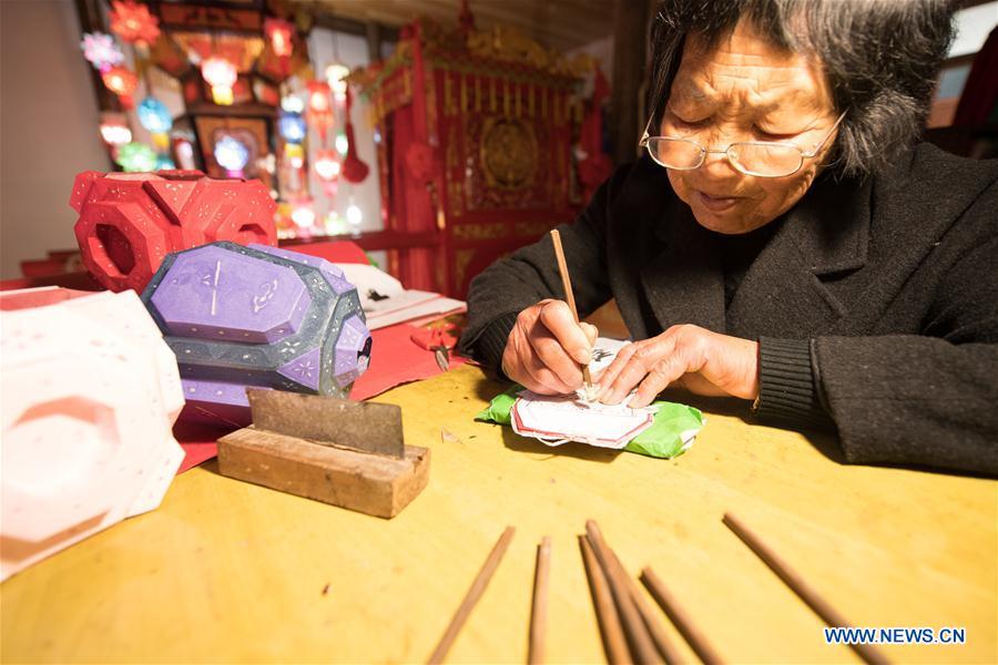 Chen Caiping makes lanterns at a workshop in Xianju County, east China's Zhejiang Province, Feb. 27, 2018. As the Lantern Festival draws near, the lantern making skill successor Wang Rulan and her daughter-in-law Chen Caiping are busy making lanterns. Lantern making in Xianju has been listed as one of the national intangible cultural heritages in 2006. (Xinhua/Weng Xinyang)