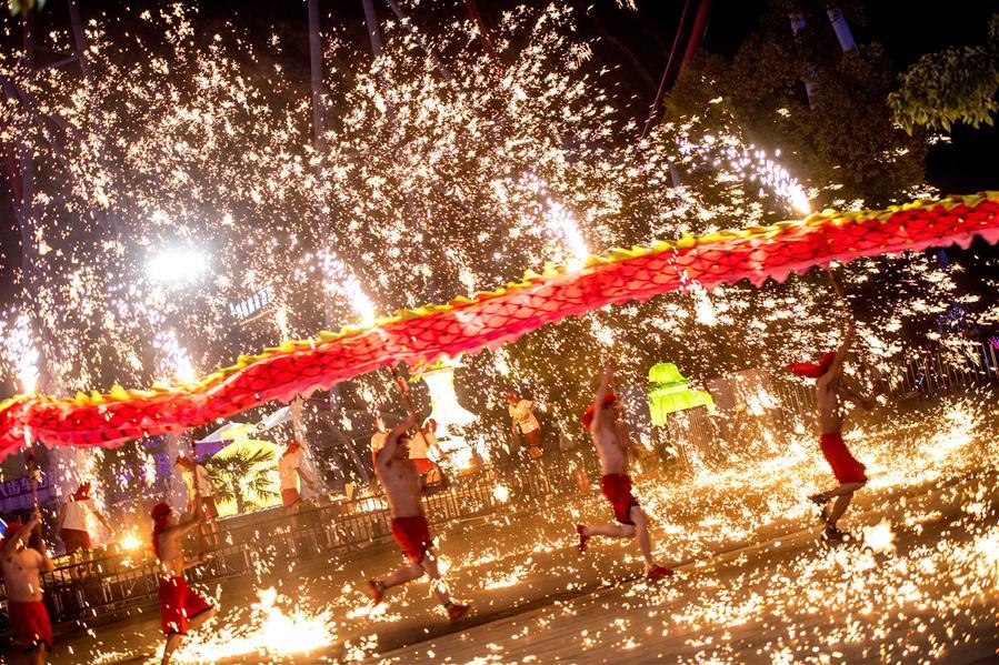 People perform fire dragon dance in shower of molten iron sparkling like fireworks to greet the upcoming Lantern Festival at the Wuhan Happy Valley in Wuhan, capital of central China's Hubei Province, Feb. 28, 2018. The Lantern Festival falls on the 15th day of the first lunar month, or March 2 this year.(Xinhua/Xiong Qi)