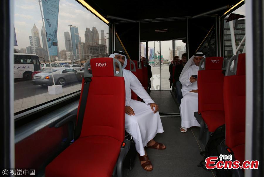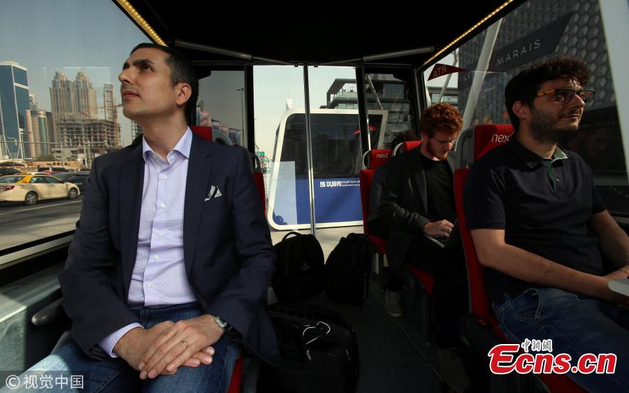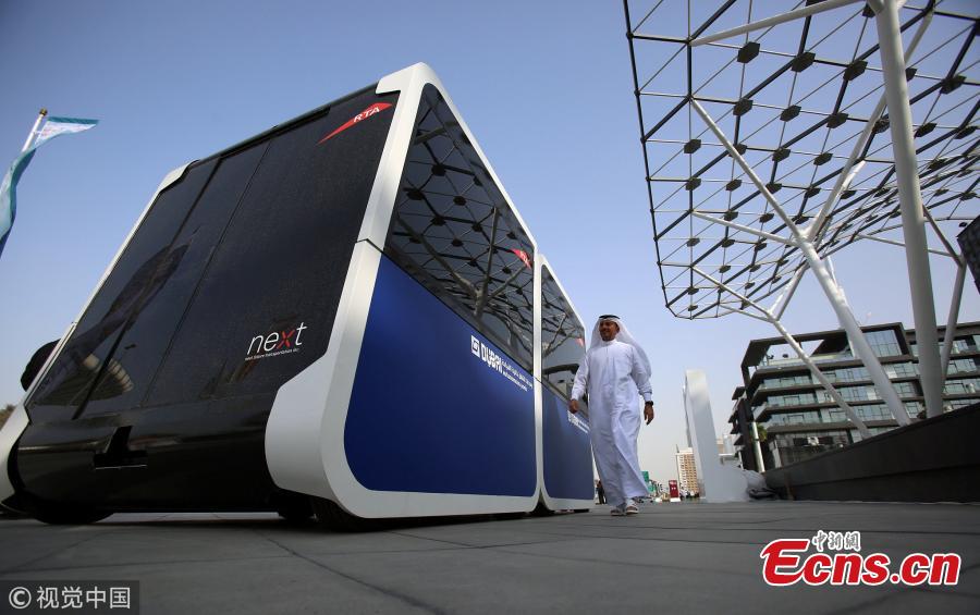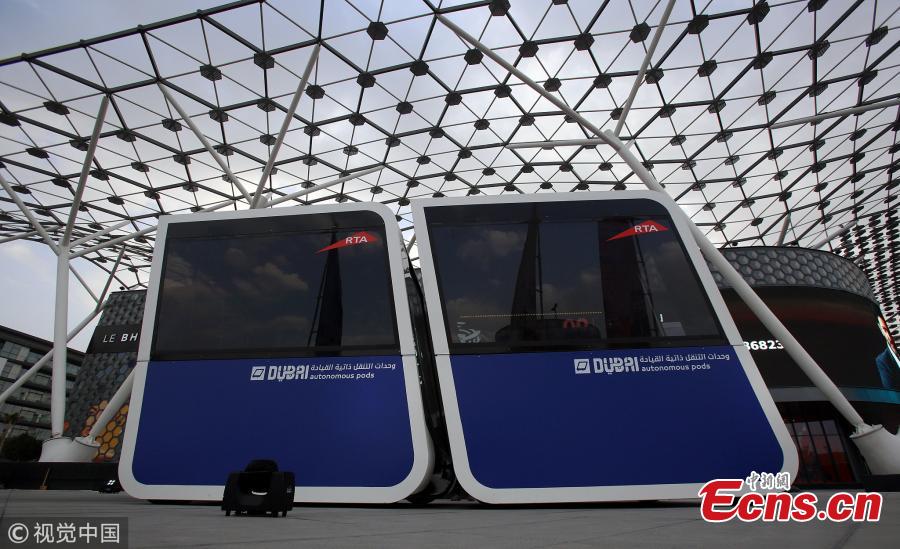 The world's first autonomous pods launched by the Roads and Transport Authority of Dubai is seen in Dubai, United Arab Emirates, Feb. 28, 2018. The autonomous pods - launched in cooperation with Next Future Transportation - are designed to travel short and medium distances in dedicated lanes. They can be coupled together in as little 15 seconds or detached - depending on the riders' destination - in five seconds. Each pod is fitted with cameras and electromechanical technologies to carry out the coupling and detaching, which can be activated while the pod is in motion. (Photo/VCG)