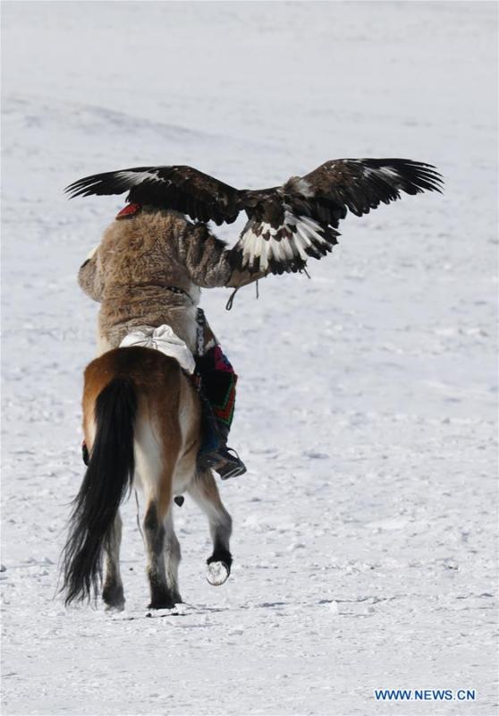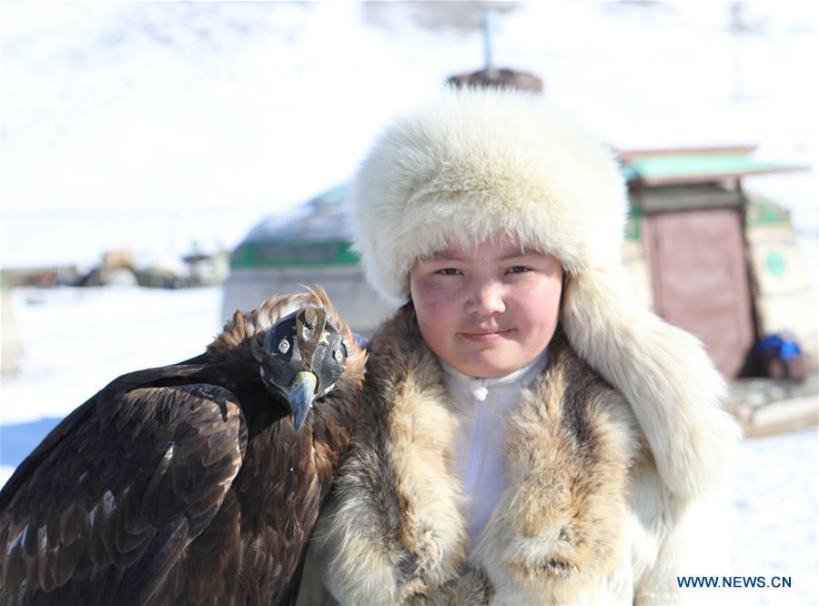 An eagle hunter attends the Spring Golden Eagle Festival near the Mongolian capital city of Ulan Bator on March 4, 2018. The Spring Golden Eagle Festival, a traditional Mongolian festival, opened near the capital city of Ulan Bator on Sunday, with the aim to promote ethnic Kazakh cultures and boost tourism. Twenty eagle hunters aged 14-86 are competing in the 11th edition of the two-day festival. (Xinhua/Asigang)