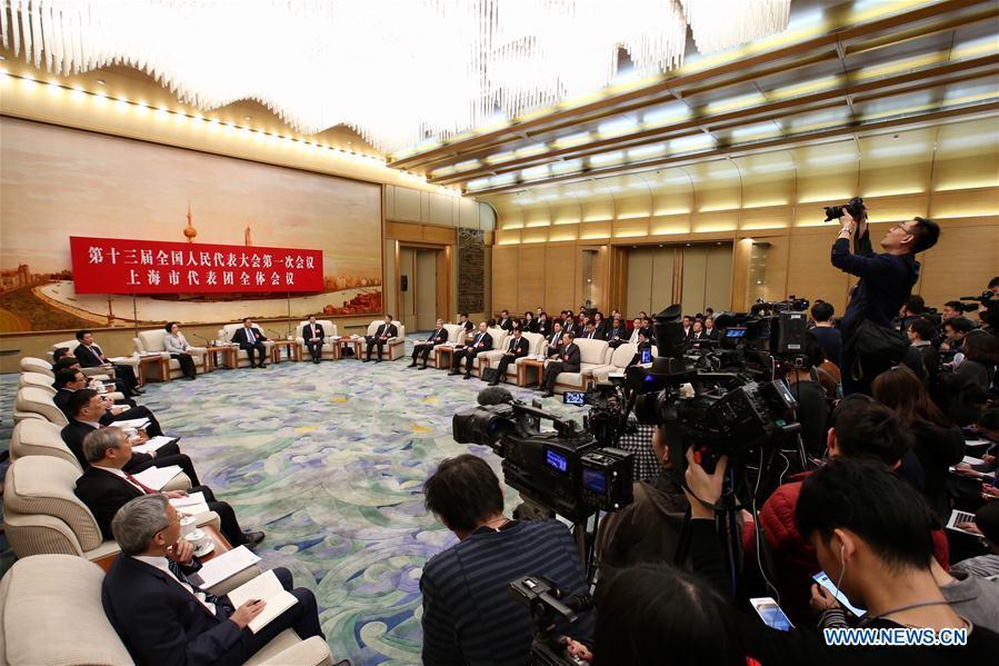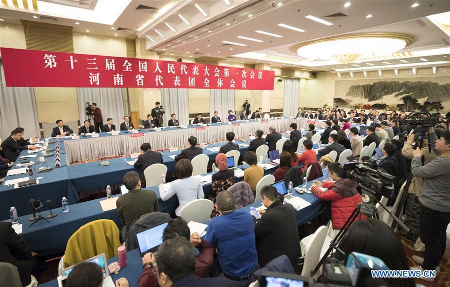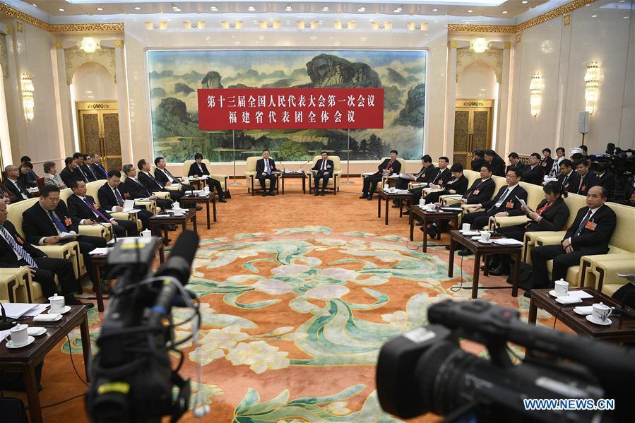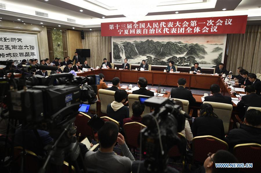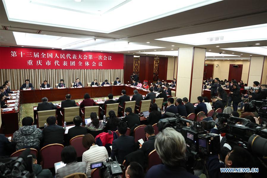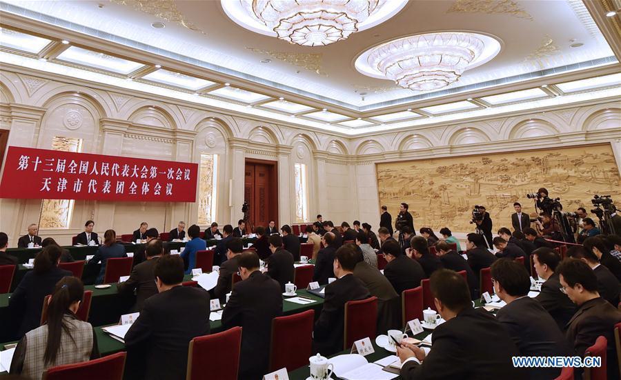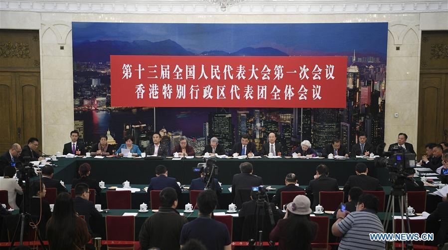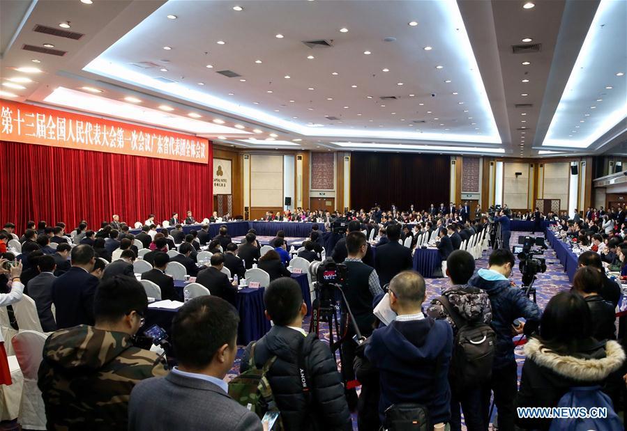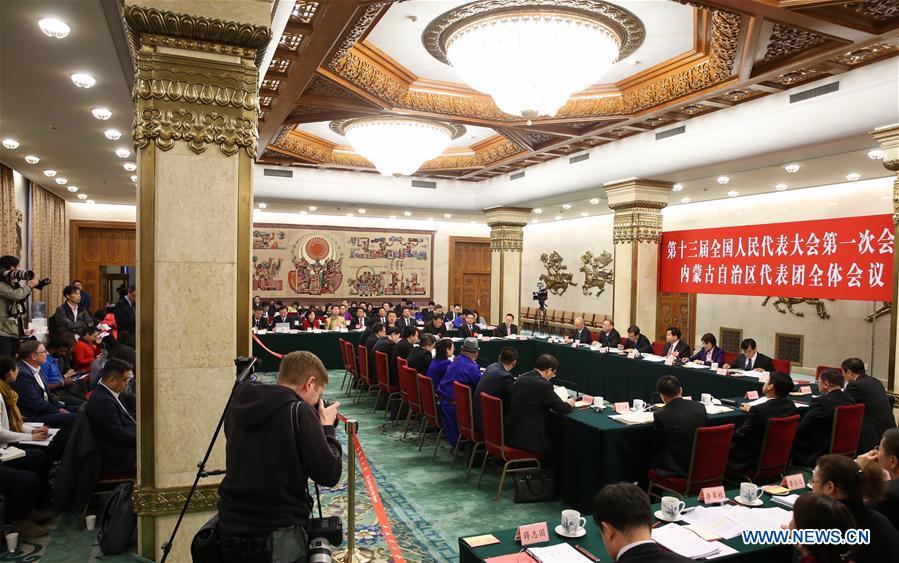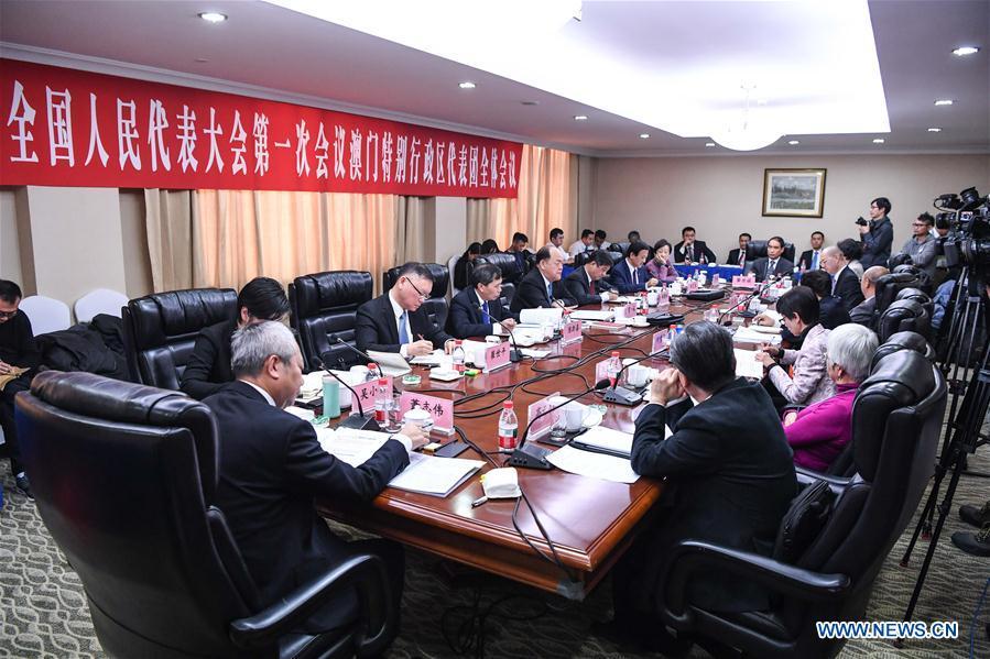 Photo taken on March 5, 2018 shows the scene of a plenary meeting of deputies from Macao Special Administrative Region at the first session of the 13th National People's Congress in Beijing, capital of China. The meeting was opened to media. (Xinhua/Shen Hong)