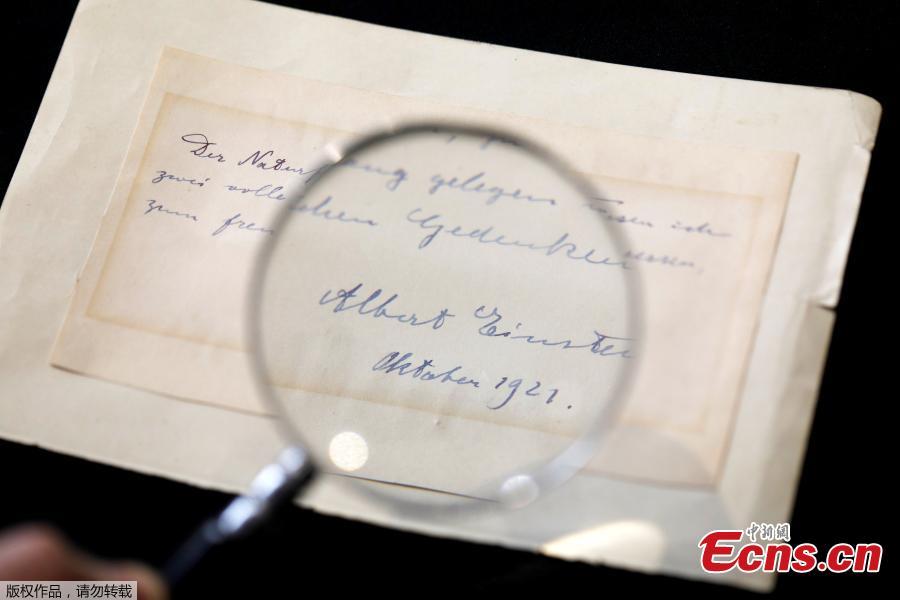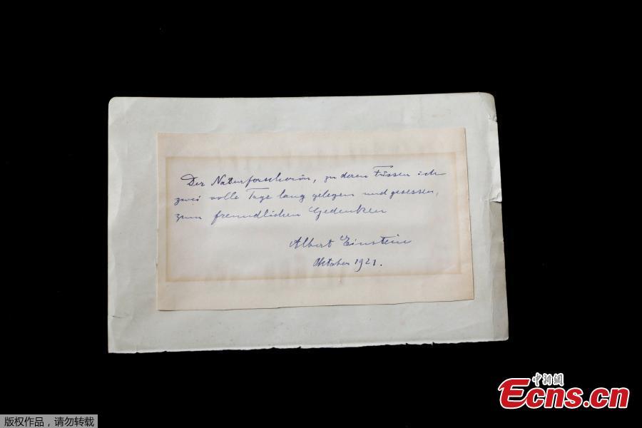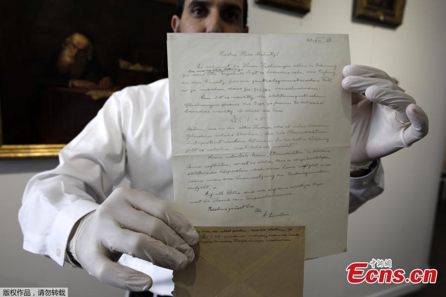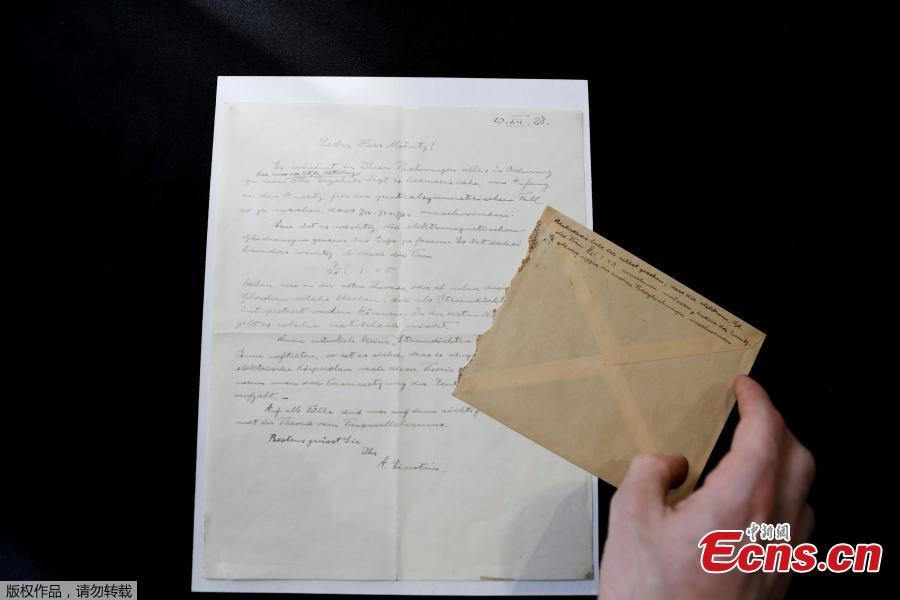 A letter written by Albert Einstein in 1928, in which according to the auction house he outlined ideas for his "Third Stage of the Theory of Relativity", is seen before it is sold at an auction in Jerusalem, March 6, 2018. A note written by Albert Einstein to an Italian woman scientist who had declined to meet him sold at auction on Tuesday along with a batch of other letters left by the renowned physicist. (Photo/Agencies)