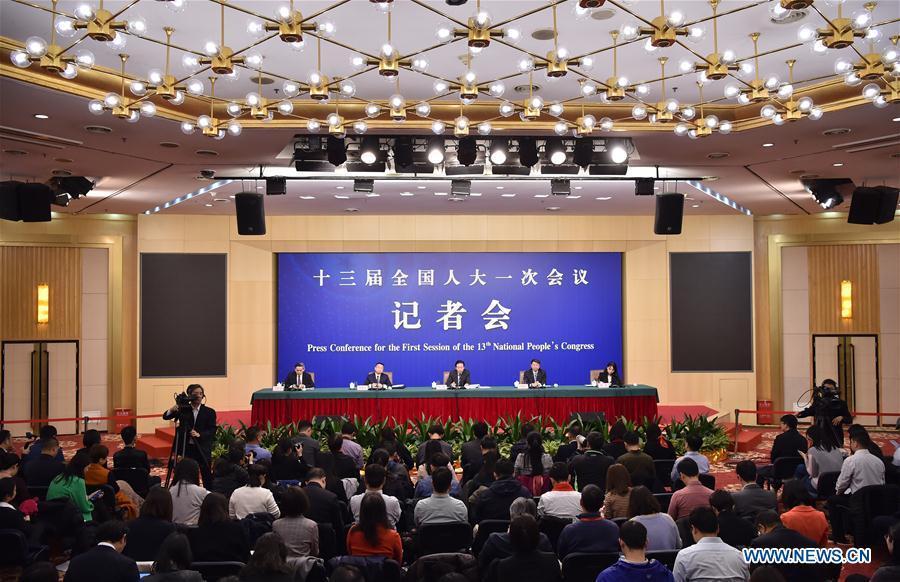 Chinese Minister of Agriculture Han Changfu (2nd L) and Director-General of General Office and spokesperson of the ministry Pan Xianzheng (2nd R) take questions at a press conference on implementation of the rural revitalization strategy and promotion of transformation and upgrading of agriculture during the first session of the 13th National People's Congress in Beijing, capital of China, March 7, 2018. (Xinhua/Shen Hong)