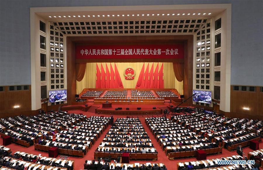The second plenary meeting of the first session of the 13th National People's Congress (NPC) is held at the Great Hall of the People in Beijing, capital of China, March 9, 2018. (Xinhua/Ding Haitao)