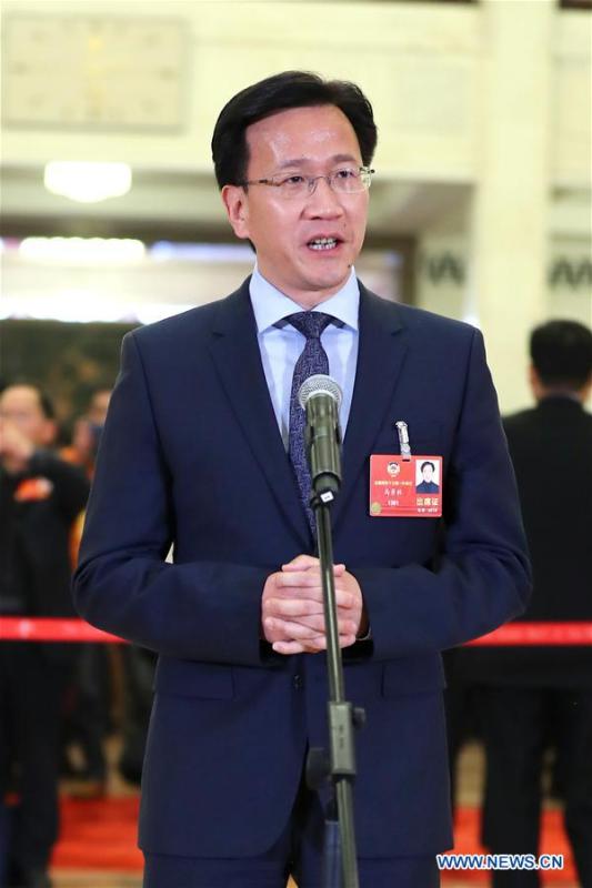 Members of the 13th National Committee of the Chinese People's Political Consultative Conference (CPPCC) Wu Weishan (R), Qi Jianbo (C) and Rongba Xinna receive an interview ahead of the third plenary meeting of the first session of the 13th CPPCC National Committee at the Great Hall of the People in Beijing, capital of China, March 10, 2018. (Xinhua/Zhang Yuwei)