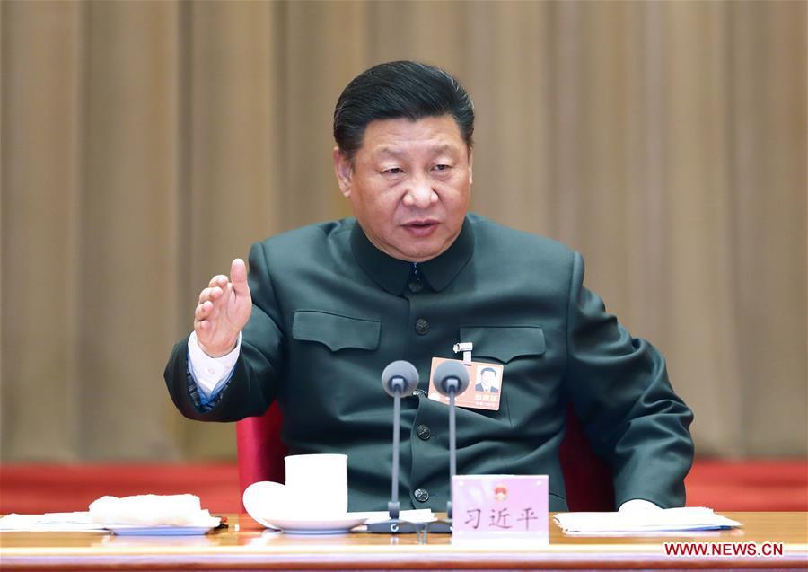 Chinese President Xi Jinping, also general secretary of the Communist Party of China (CPC) Central Committee and chairman of the Central Military Commission, shakes hands with deputies from People's Liberation Army (PLA) and armed police before attending a plenary meeting of the delegation of PLA and armed police at the ongoing session of the 13th National People's Congress in Beijing, capital of China, March 12, 2018. (Xinhua/Li Gang)