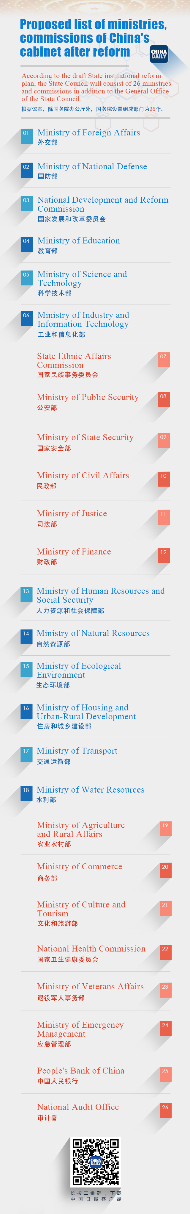 ----the functions of State Administration for Industry and Commerce, General Administration of Quality Supervision, Inspection and Quarantine and China Food and Drug Administration, forming a national market supervision administration. The new supervision administration will also include anti-trust investigation and execution functions originally under the National Development and Reform Commission and the Ministry of Commerce.