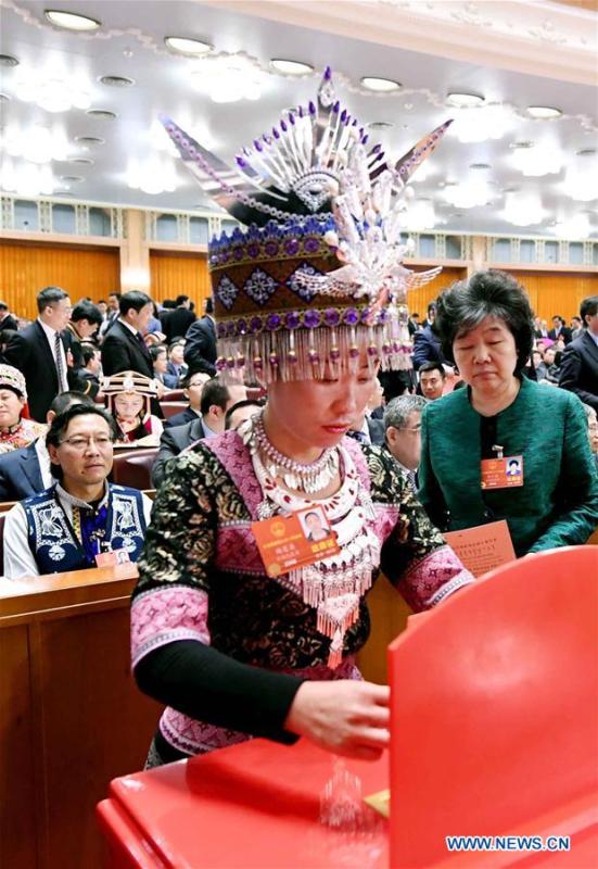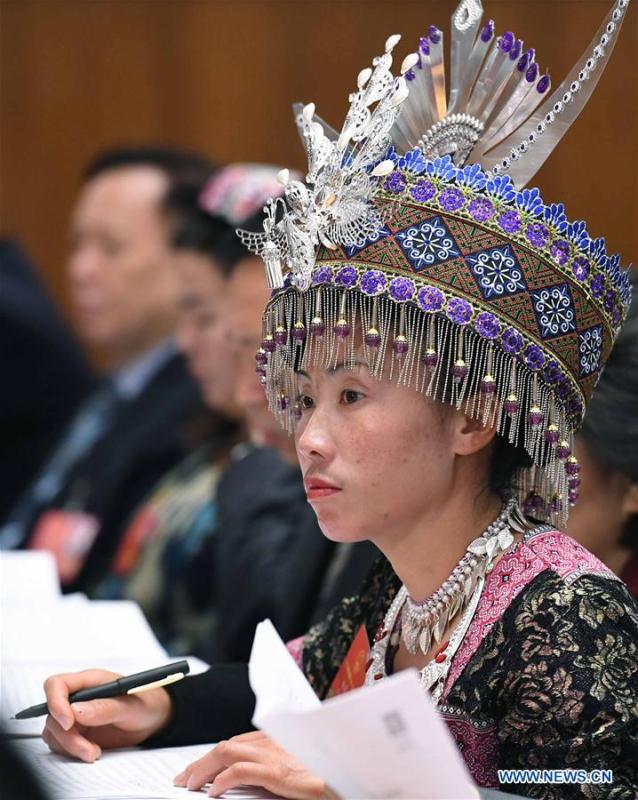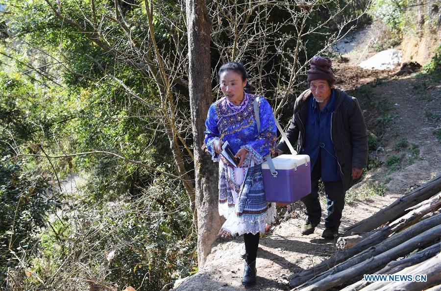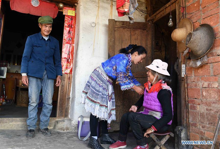 Doctor Yang Lianying of Miao ethnic group (L), a newly-elected deputy to the 13th National People's Congress (NPC), visits a patient in Dalujiao Village of Xinhua Township in Pingbian Miao Autonomous County, southwest China's Yunnan Province, Feb. 23, 2018. Yang Lianying has been the only doctor in Henan Village, which is located in remote mountain areas, for over ten years. As households are scattered over the village, Yang has to climb rough mountain roads to visit patients. Despite the hardship, she chooses to stick to her post and take care of the villagers. "Young people don't want to work in village, and old rural doctors can't meet patients' requirements." she said, "So the village faces a shortage of doctors." She wants to see more trainings and cultivation for rural doctors with better management. Even during the time Yang attends the NPC in Beijing, she still receives calls from villagers everyday asking her suggestions about medical treatments. In Yang's opinion, everyone's health matters. As a NPC deputy and a doctor, she vows to dedicate herself to the country's rural healthcare. (Xinhua/Yang Zongyou)