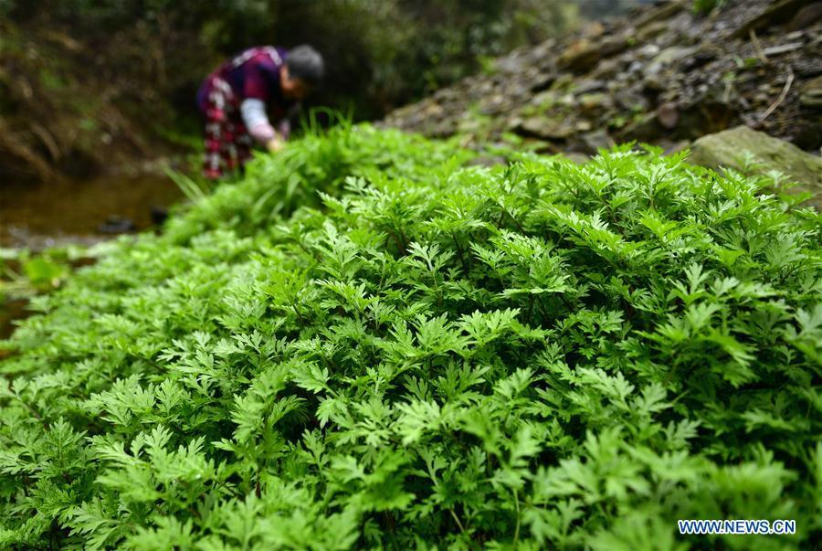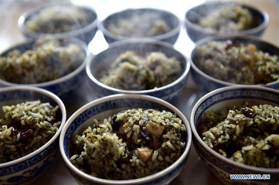 A villager mixes glutinous rice with vegetables including artemisia annua and green onion at Huoshaoying Village of Xuan'en County, central China's Hubei Province, March 14, 2018. Local people of Tujia ethnic group usually make "Shefan", a traditional food made of glutinous rice, preserved meat, artemisia annua, green onion and other vegetables, in the early spring time. (Xinhua/Song Wen)