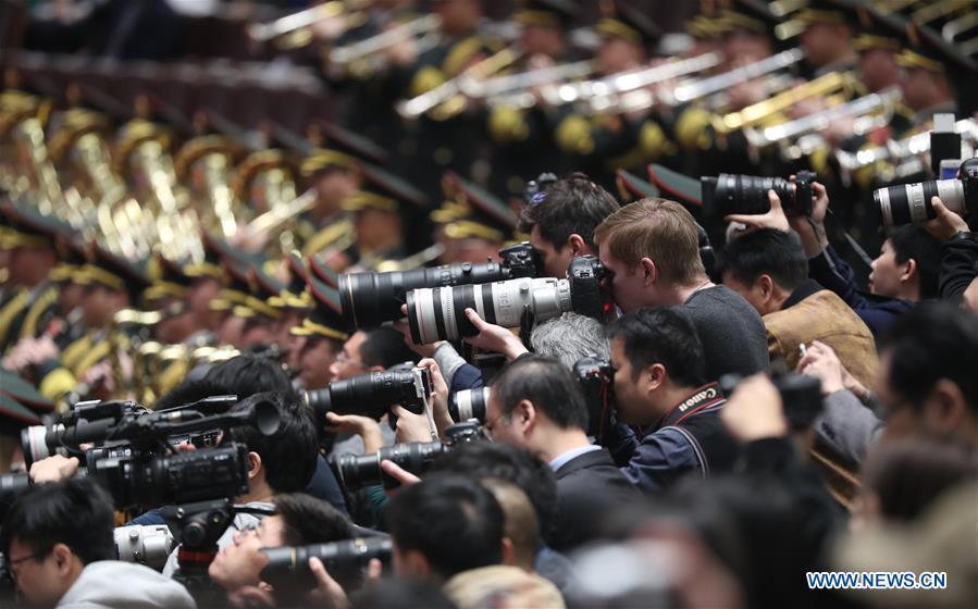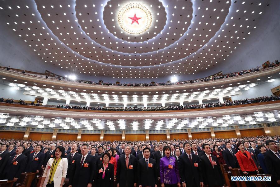 Xi Jinping (C, front), Li Keqiang (4th R, front), Zhang Dejiang (4th L, front), Yu Zhengsheng (3rd R, front), Zhang Gaoli (3rd L, front), Li Zhanshu (2nd R, front), Wang Huning (2nd L, front), Zhao Leji (1st R, front) and Han Zheng (1st L, front) attend the closing meeting of the First Session of the 13th National Committee of the Chinese People's Political Consultative Conference (CPPCC) at the Great Hall of the People in Beijing, capital of China, March 15, 2018. (Xinhua/Ding Lin)