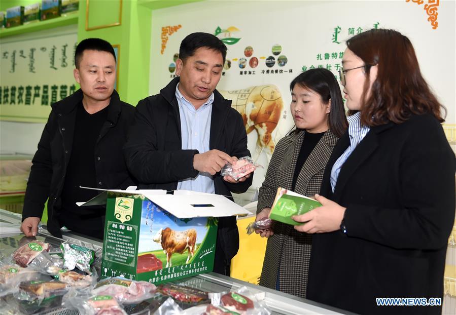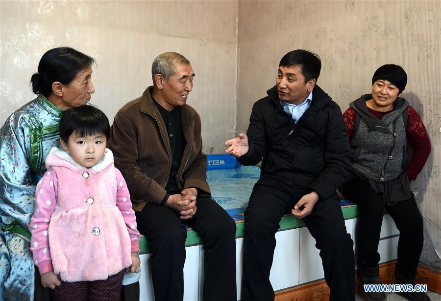 Wu Yunbo checks on cattle at his cooperative of Dongsala Village in Jarud Qi (County), north China's Inner Mongolia Autonomous Region, Feb. 25, 2018. Wu Yunbo of Mongolia ethnic group comes from Dongsala Village of Jarud Qi (County) of north China's Inner Mongolia Autonomous Region. As a secretary of the Communist Party of China local branch in the Dongsala Village, he initiated a cooperative in 2013 and explored a way to get people out of poverty. Farmers and herdsmen were encouraged to join the cooperative by investments in the form of cash, croplands or cattle. The total assets of the cooperative have been valued at 34 million yuan (5.4 million U.S. dollars) so far. Its net profit in 2017 reached 3.6 million yuan (568,720 U.S. dollars). The cooperative, which is growing steadily, has helped 37 households shake off poverty. As a deputy to the 13th National People's Congress, Wu is considering to lead all villagers and herdsmen of the village to get rich by further expanding the cooperative and scaling up cattle breeding business. (Xinhua/Peng Yuan)