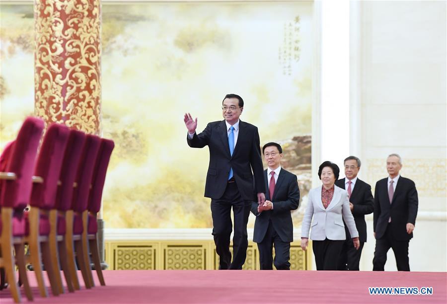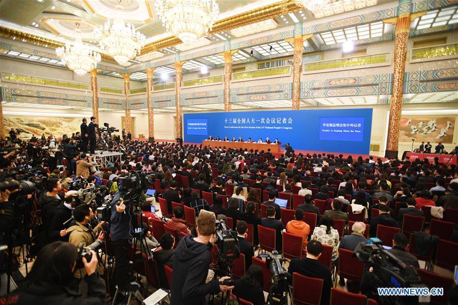 Chinese Premier Li Keqiang (C), vice premiers Han Zheng (4th L), Sun Chunlan (3rd R), Hu Chunhua (3rd L) and Liu He (2nd R) attend a press conference after the conclusion of the first session of the 13th National People's Congress (NPC) at the Great Hall of the People in Beijing, capital of China, March 20, 2018. (Xinhua/Ding Lin)