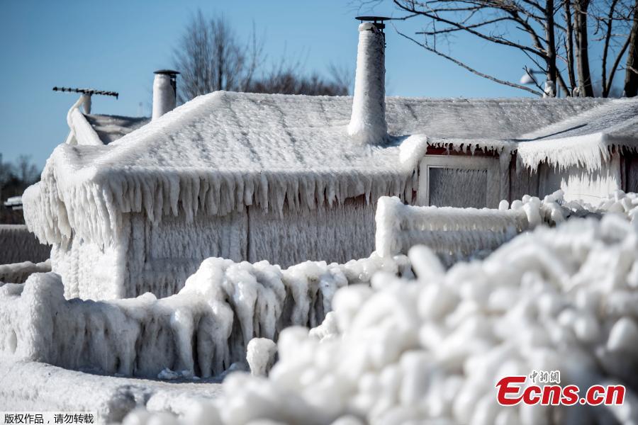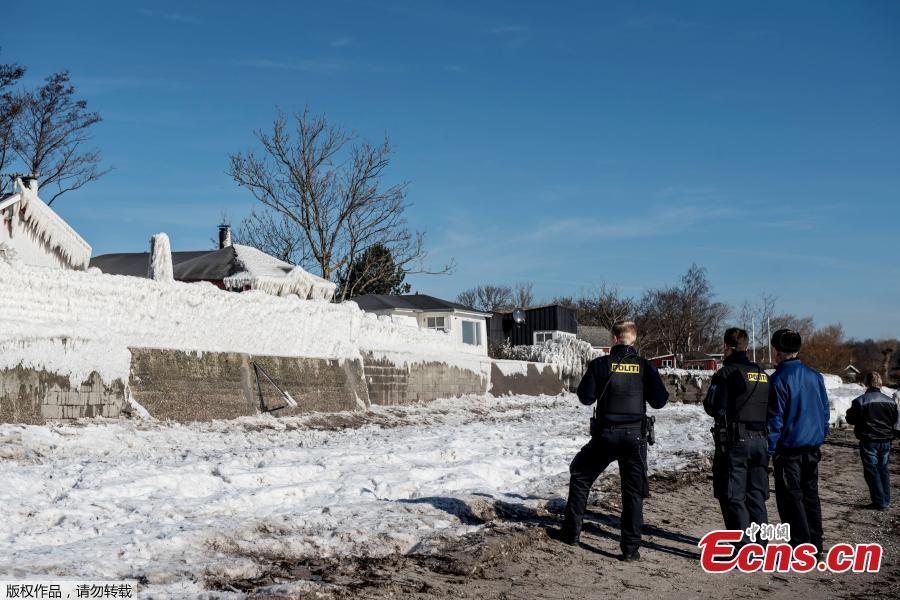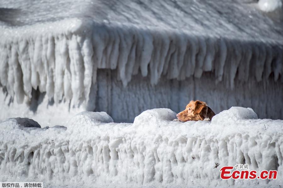 A dog looks over a wall in front of a house covered in ice, at Faxe Bay, South of Copenhagen, Denmark, March 19, 2018. Due to strong winds, water hit four houses near the sea front and freezing temperatures resulted in the houses being covered in layers of ice. (Photo/Agencies)