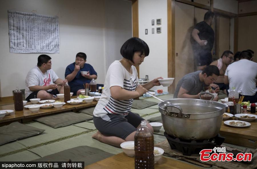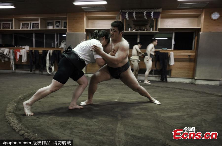 A female sumo wrestler during a training session at Nihon University's sumo club in Tokyo. National tours by female sumo wrestlers have failed to attract more women into Japan's national sport. (Photo/Sipaphoto)