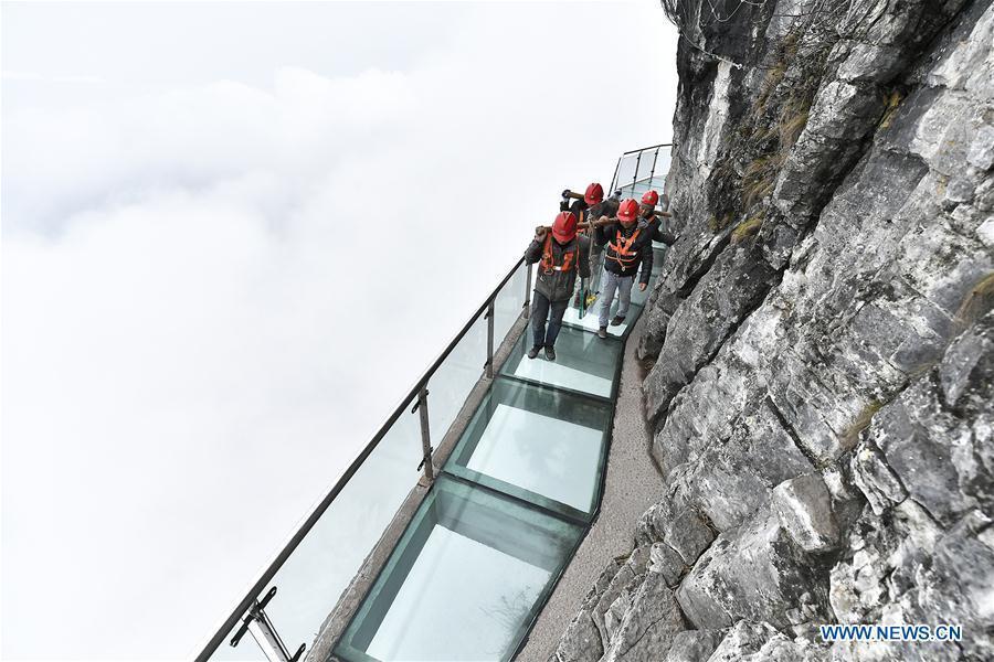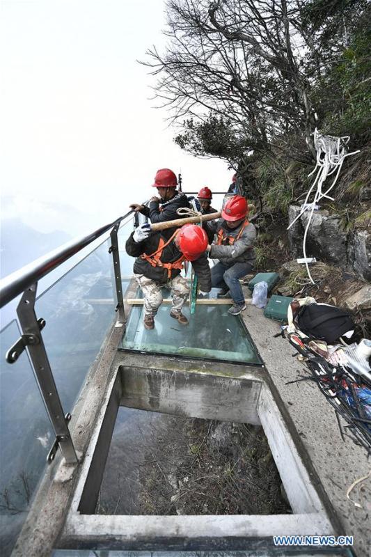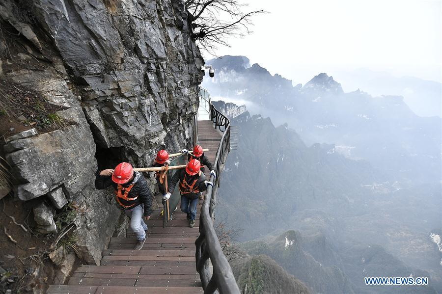 Workers carry glass plates for the replacement of the glass pavement at Tianmenshan scenic area in Zhangjiajie, central China's Hunan Province, March 21, 2018. Replacement work of the glass pavement on the west line in Tianmenshan is in progress, which is expected to complete in two days. (Xinhua/Shao Ying)