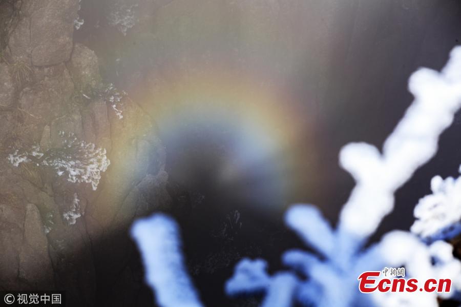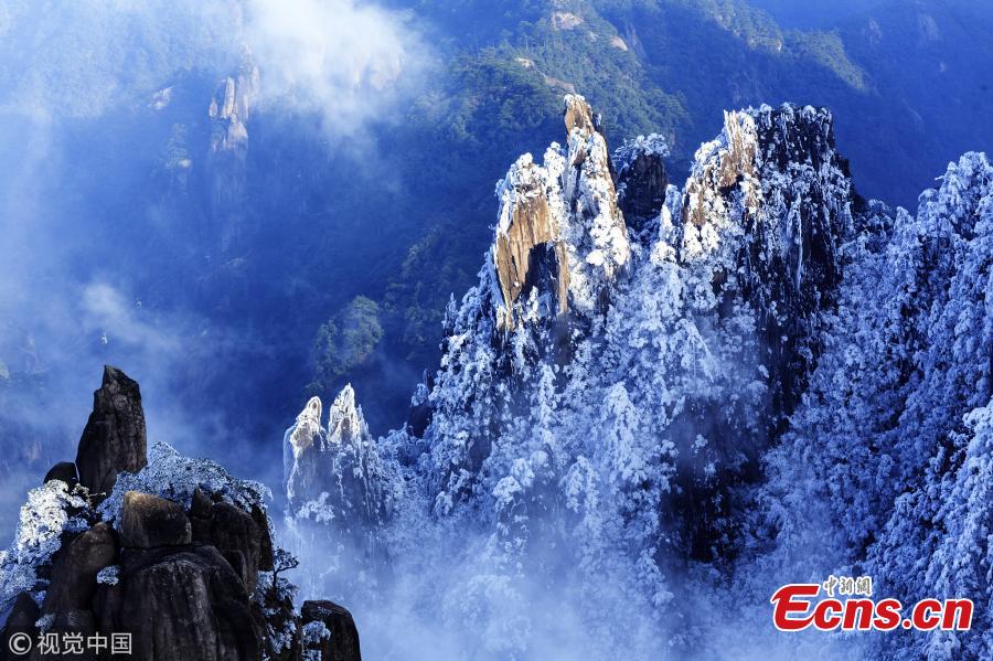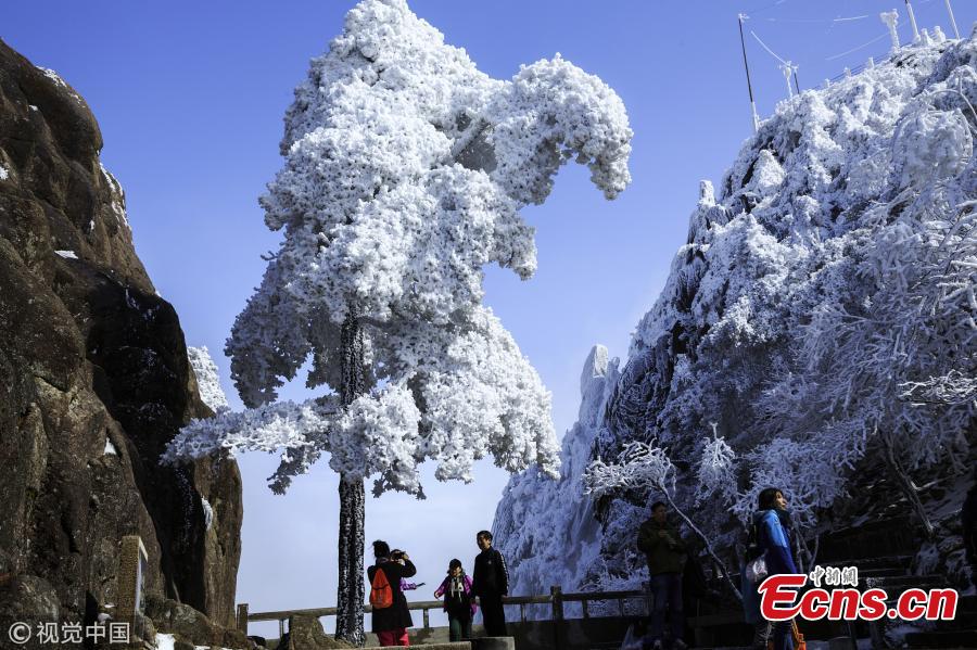Photo taken on March 21, 2018 shows the beautiful Huangshan Mountain in Anhui Province. As a UNESCO World Heritage Site and one of China's major tourist destinations, Huangshan is well known for its sunsets, peculiarly-shaped granite peaks, pine trees, winter snow, and views of the clouds from above. (Photo/VCG)