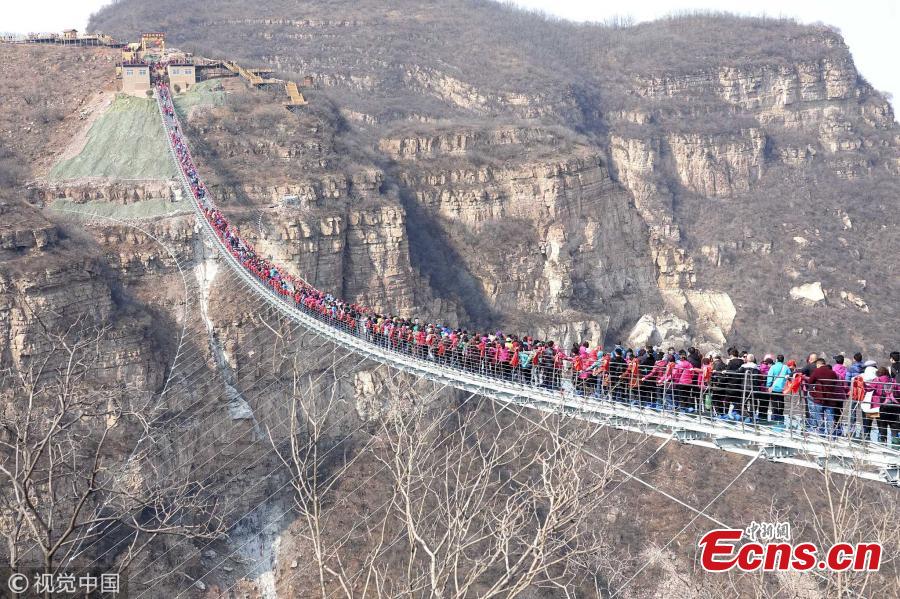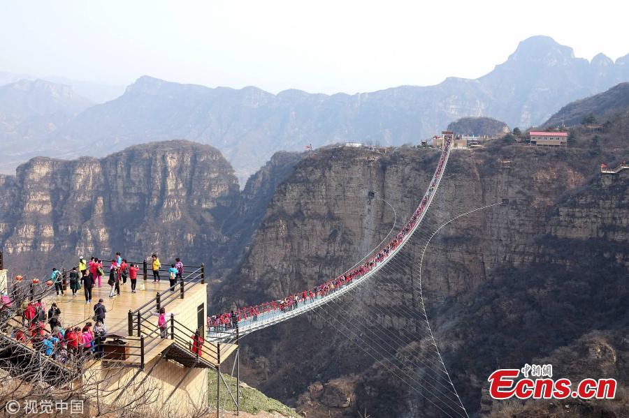 The world's longest glass bridge attracts tourists in Shijiazhuang, north China's Hebei province, March 20, 2018. The bridge, which stretches 488 meters, is 4 meters wide and hangs 218 meters above the valley floor between two steep cliffs. The bridge is designed to swing a little as people walk to its center, creating a thrill for visitors. While walking on the bridge, tourists can enjoy the surrounding Hongyagu scenery, which boasts a unique geographic landscape with mountain views, natural waterfalls, ancient towns and temples. (Photo/VCG)