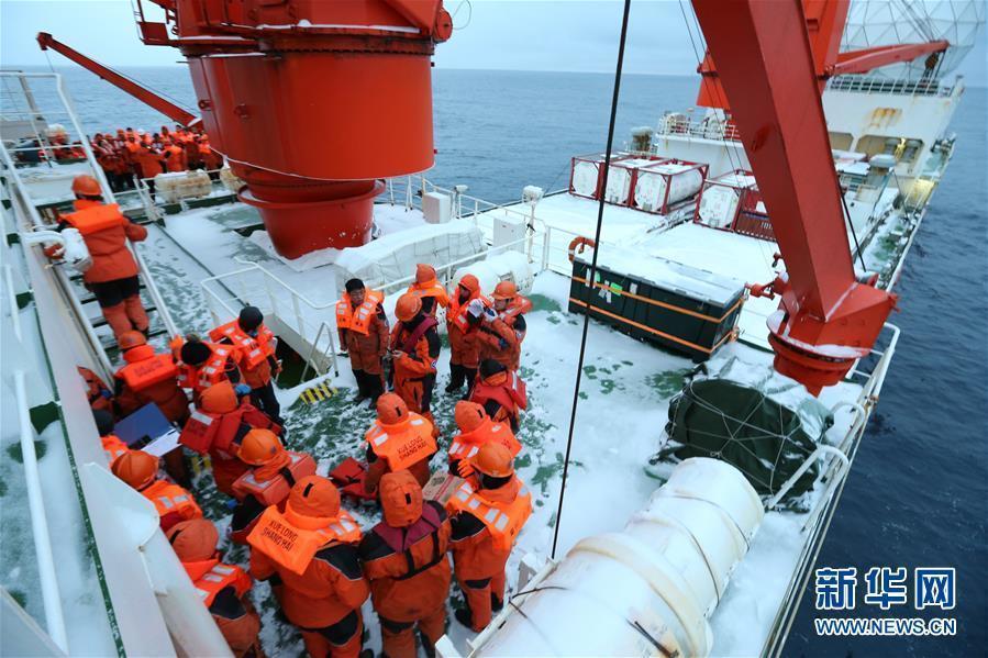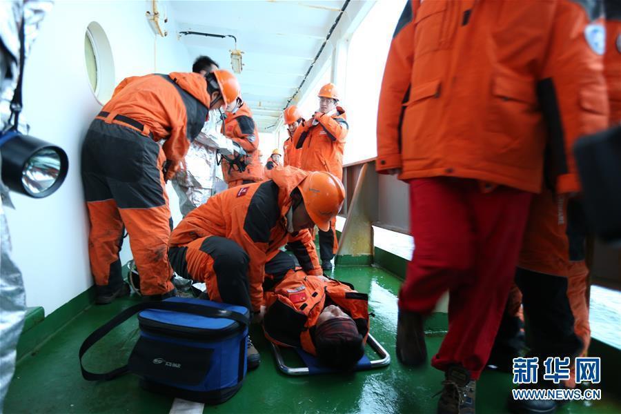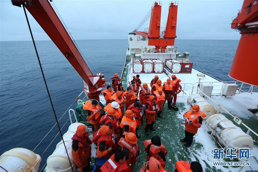 Photo taken on March 22, 2018 shows crew members and researchers taking part in a drill simulating a fire on Chinese icebreaker "Xuelong", meaning Snow Dragon, in the Amundsen Sea. The icebreaker is on its 34th Antarctic expedition. (Photo/Xinhua)