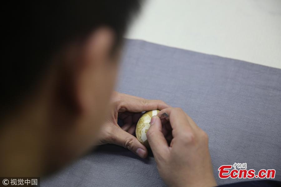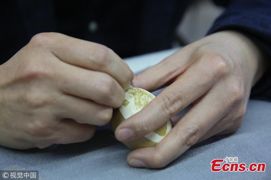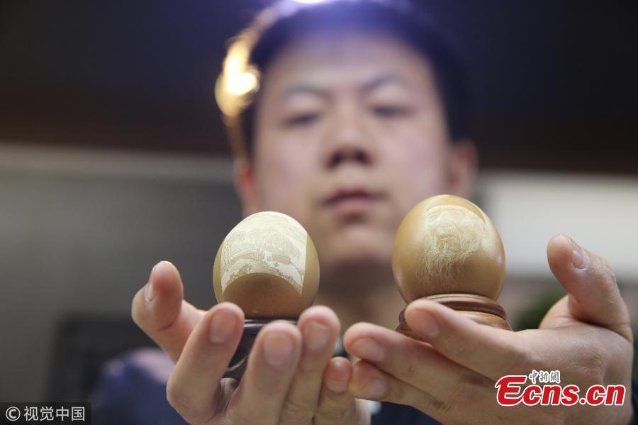 Wang Chengxiao carves an eggshell in his studio in Taiyuan City, the capital of North China's Shanxi Province, March 21, 2018. Wang has dedicated himself to eggshell carving for 21 years. He often goes to different supermarkets in order to buy eggs of similar sizes and patterns. It usually takes him 20 days to finish an eggshell creation, using up four surgical knife blades in the process. Wang said some of his works on the 0.5-millimeter-thick eggshell were worth 10,000 yuan ($1,580) each. (Photo/VCG)