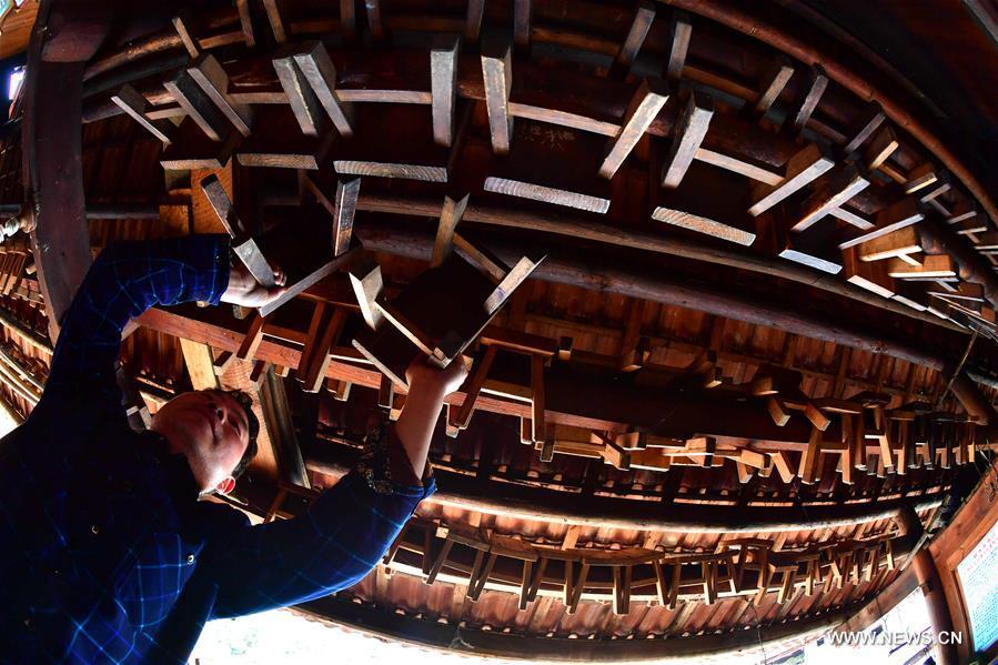Wu Ni carries stools and prepares to take part in an activity in Gandong Township of Rongshui Miao Autonomous County, south China's Guangxi Zhuang Autonomous Region, March 13, 2018. Lives of villagers in Rongshui Miao Autonomous County have been improved since the poverty alleviation measures were taken. One obvious change in their families is the increased stools as more stools are needed when they hold big celebrations to entertain friends and visitors. (Xinhua/Huang Xiaobang)