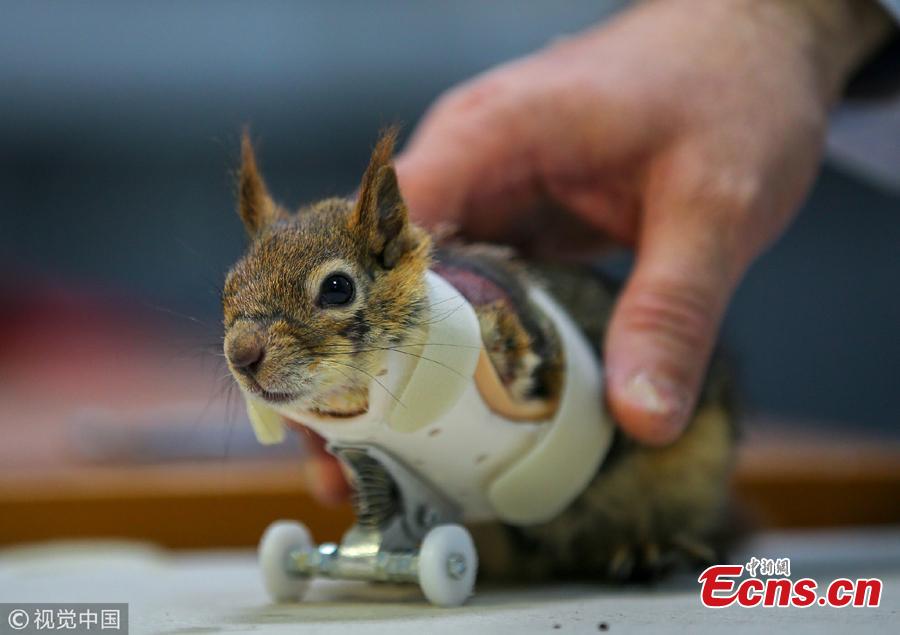 Karamel, the squirrel who lost his front paws after he got stuck on a wild animal trap in Batman, wears its temporary prosthesis for the first time at Istanbul Aydin University Vocational School of Health Services in Istanbul, Turkey, March 30, 2018. (Photo/Agencies)