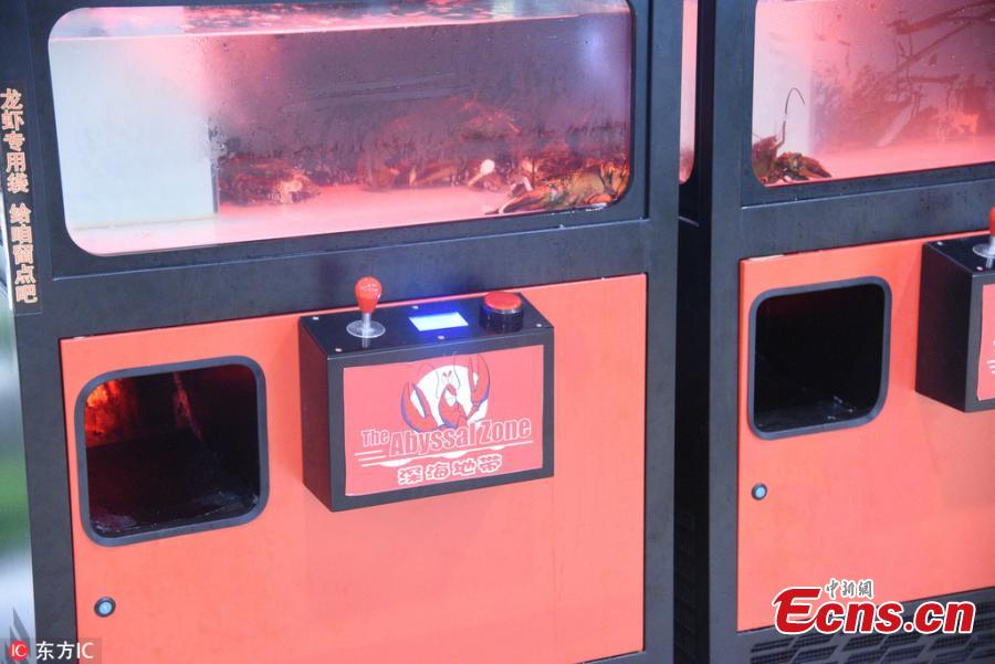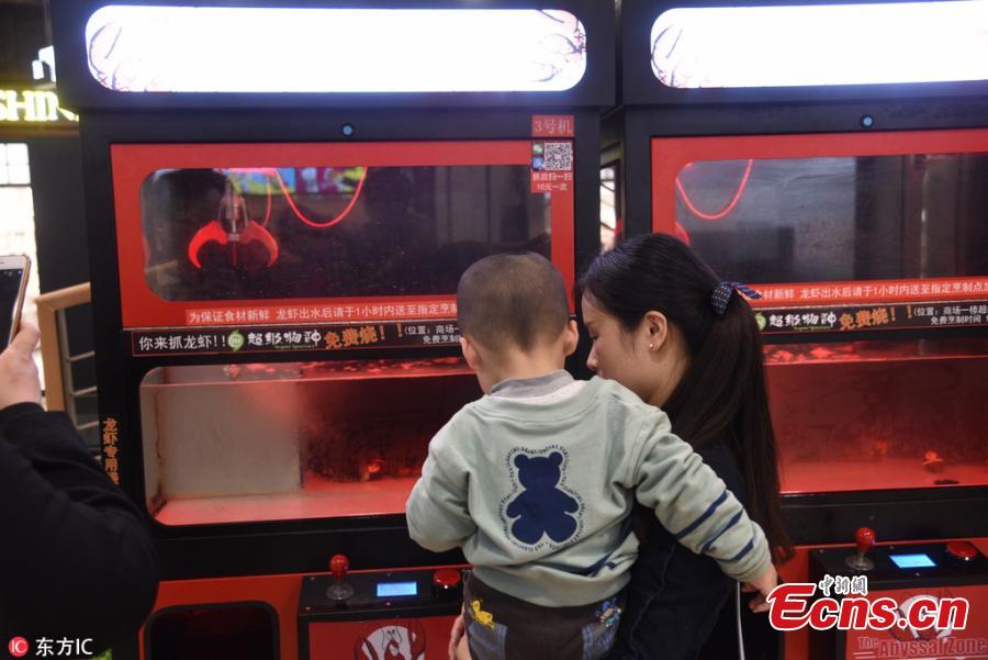 A renovated claw machine with Australian lobsters as prizes at a shopping mall in Nanjing City, the capital of East China's Jiangsu Province, April 2, 2018. Players pay 10 yuan ($1.5) for one attempt to nab a fresh lobster and winners receive the seafood cooked for free. (Photo/IC)