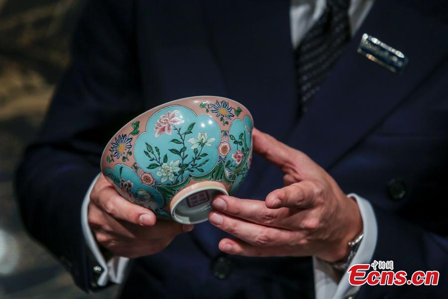 A superbly enamelled, fine and exceedingly rare pink-ground falangcai bowl from the period of Kangxi in Qing Dynasty (1644-1911) is displayed during Sotheby's Spring auction in Hong Kong, April 3, 2018. The extremely rare bowl fetched HK$238,807,500 (US$30,428,852) at auction yesterday. (Photo/Agencies)
