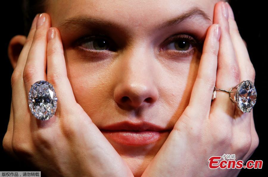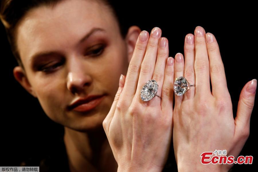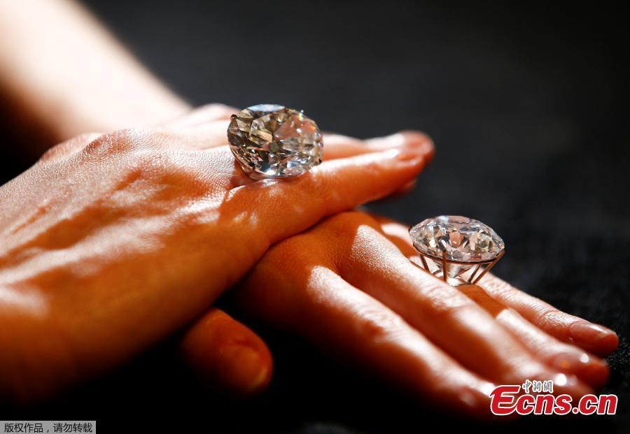 A model poses with two white diamonds, each over 50 carats, at Sotheby's auction house in London, Britain, April 6, 2018. (Photo/Agencies)